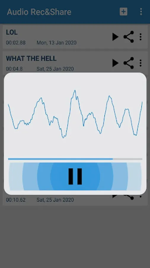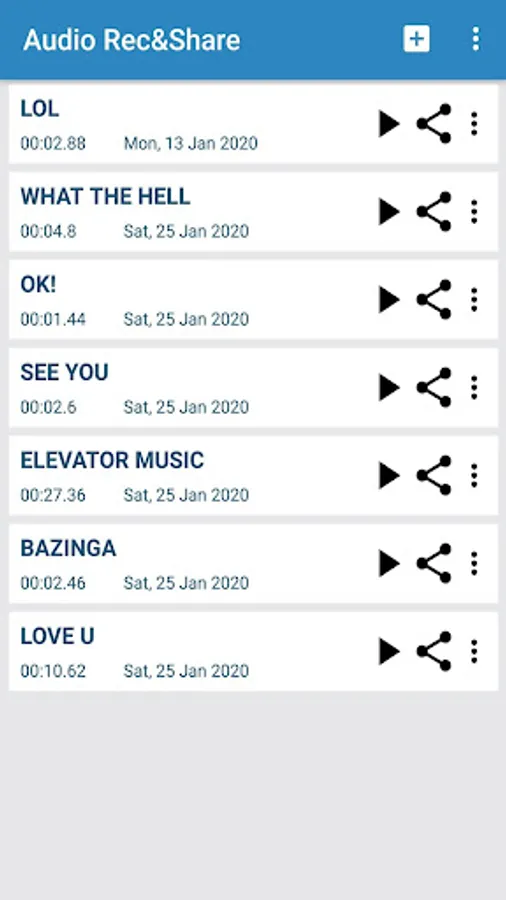 The app basically acts as a digital folder of audio recordings. It lets the user record voice audios, parts of a song or a movie, or just onomatopoeias, listen to them before storing them, and save them in the app so that you can later listen to them again and send them through any means of communication that your smartphones allows you: Facebook, Whatsapp, Telegram, Messenger, Bluetooth, email, NFC, WIFI, Google Drive, Dropbox, any many more.