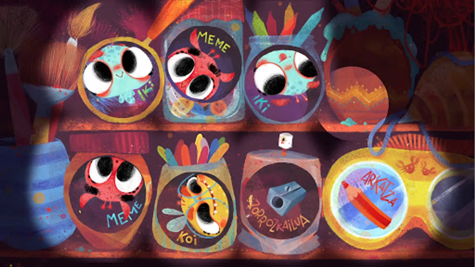 KOKOAK (Eider Eibar and Iskander Sagarminaga) is a game based on an idea by the authors. Eider Eibar, an illustrator of children's literature, has drawn the contents of the game. It is a game developed in collaboration with KOKOAK and HARROBIAK with the support of the Basque Government. Programming: Josu Cobelo / Coordination: Zuri Alvarez / Music: Mikel Iraurgi / Texts: Miren Amuriza.