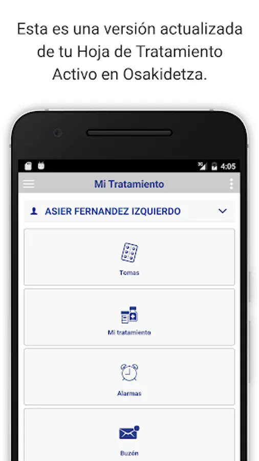 Application to query your Active Treatment in Osakidetza, where the medication prescribed for pickup in the pharmacy is included. It also provides a number of aids to facilitate compliance with the requirement: observations related to treatment, alarms associated with intakes of medication, when to collect the medication, prescriptions status with Visa, etc.