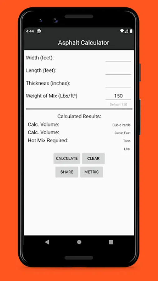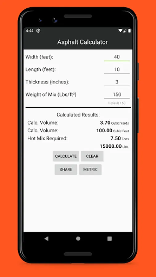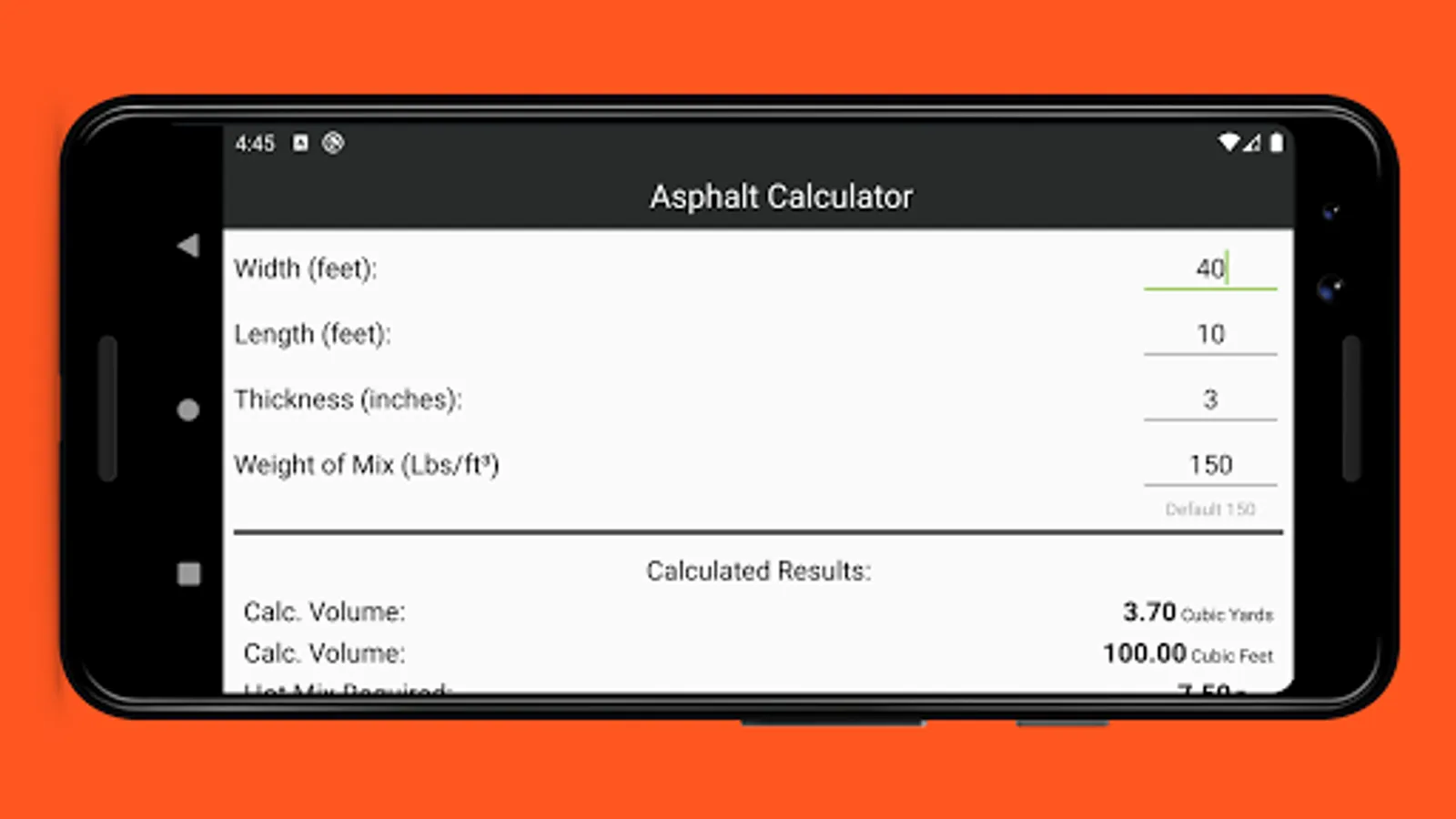 Asphalt Calculator app will calculate the amount of cubic yards needed for a given job. It will also calculate hot mix tonnage. Simply input the length and width in feet and the thickness in inches and tap on the calculate button for your results.