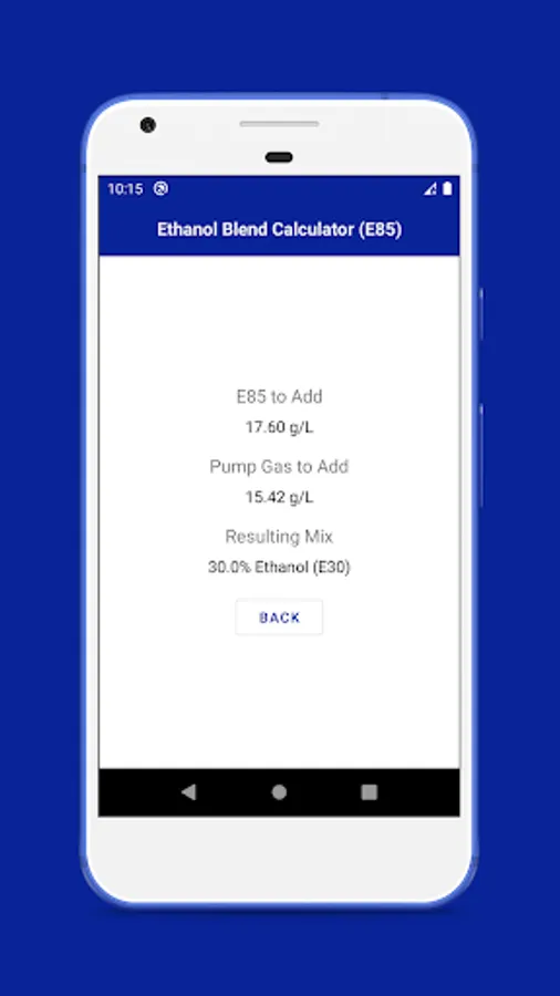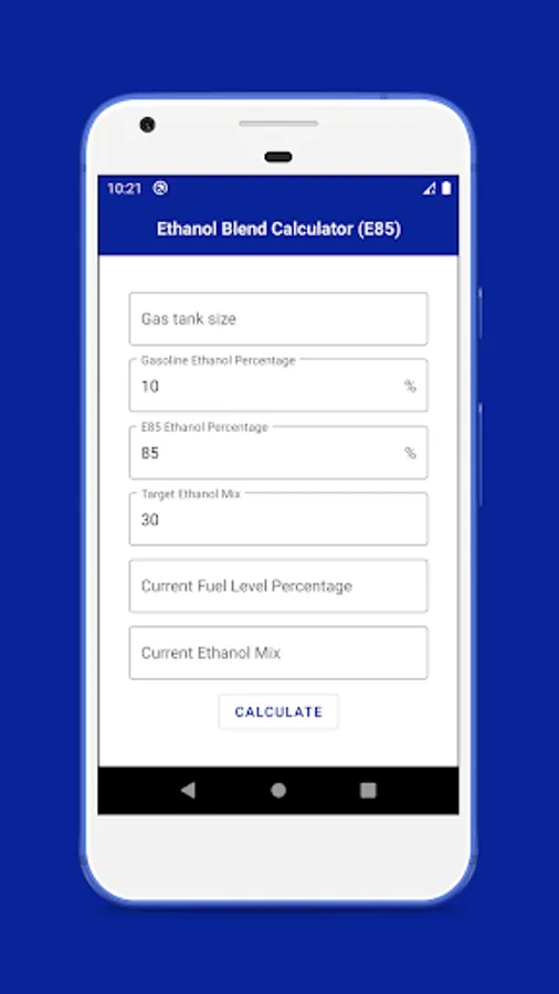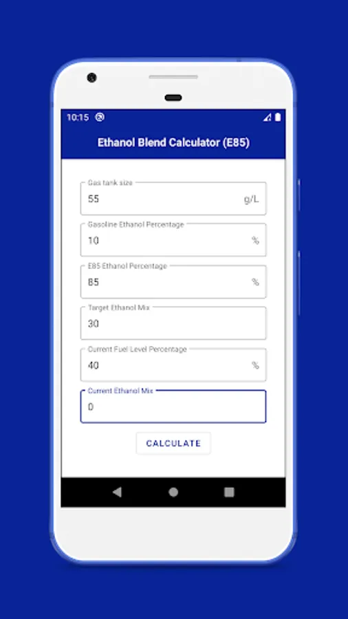 To find the right ethanol mix, enter your gas tank size, current fuel level, and current ethanol mix in your tank. Click the "calculate" button and app automatically calculate how much E85 and pump gas you need to blend.