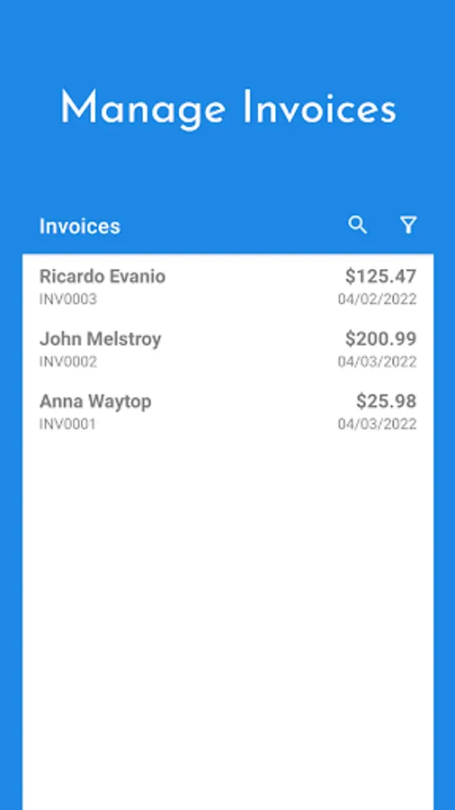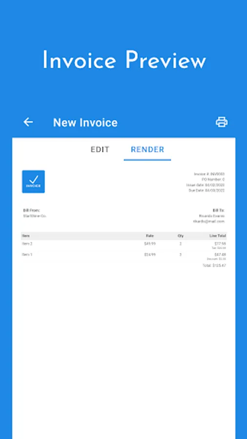Make invoices with a simple invoice template. Create beautiful and clean receipts in a few taps. Just fill in all standard information, and the app make personal invoice for you.