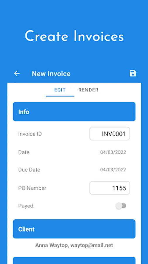 Simple Invoice Maker - is a power tool for invoice generation with a simple template and clean interface. Without subscriptions or limitations for any amount of data. It's your digital helper that aims to speed up work using the modern technologies for invoice making and clients management