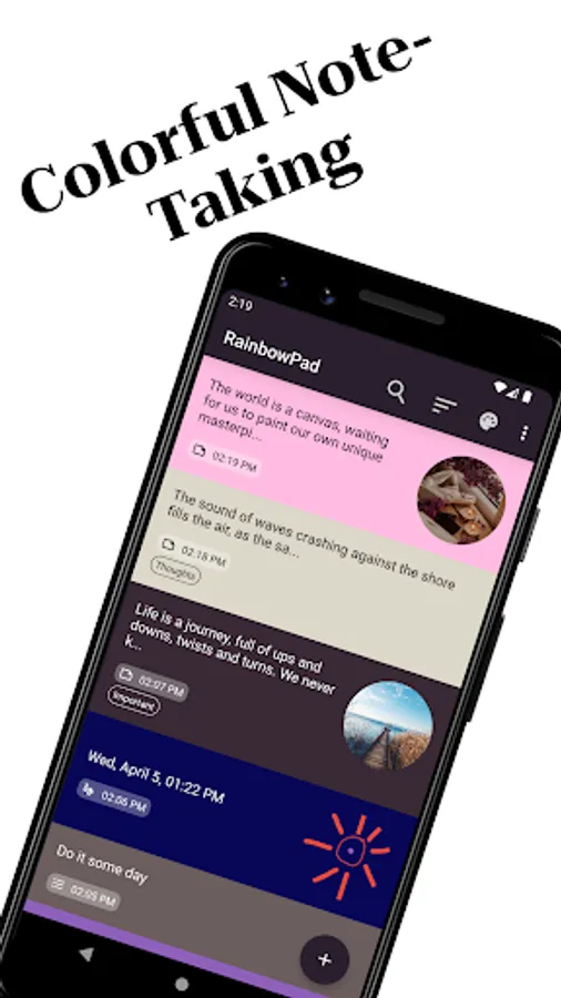 ** Express yourself with customizable color notes: Choose from various color options for your notes, matching your mood and personalizing your notebook experience. Create a pink notepad, black AMOLED notes, or any other hue that speaks to you.