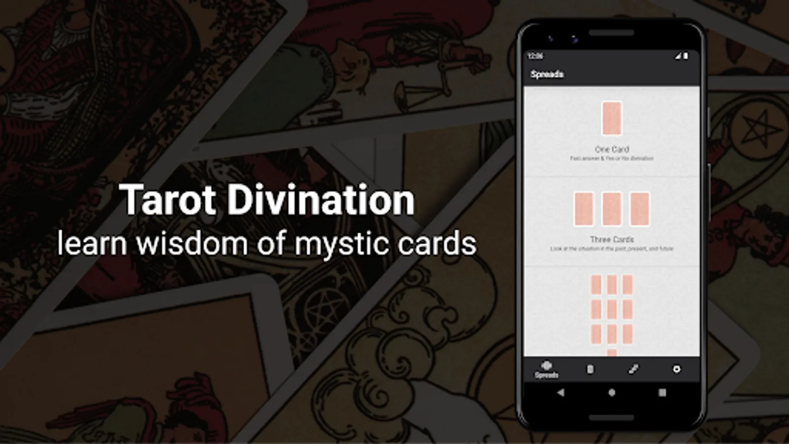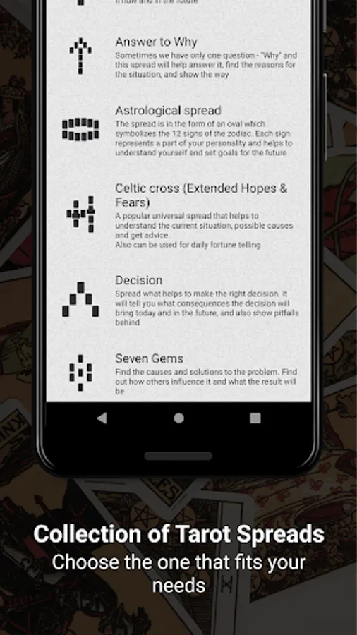 Change spreads backgrounds to one of 7 beautiful patterns designed to not distract from tarot reading but make it unique and personal. Connect yourself with the cosmic energy of tarot cards with custom cards covers. Make your journey personal!
