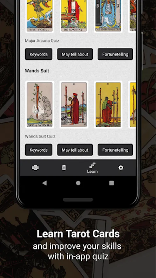 Learn tarot card meanings with a tarot quiz. Build strong bounds with the energy of tarot using a simple yet powerful way of learning by answering quiz questions. The app contains meanings for every popular type of tarot reading, so everything is also included in a quiz.