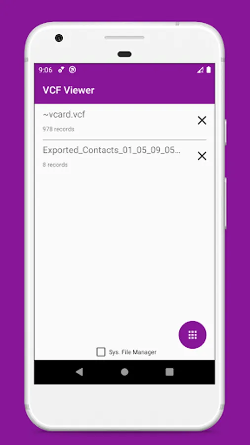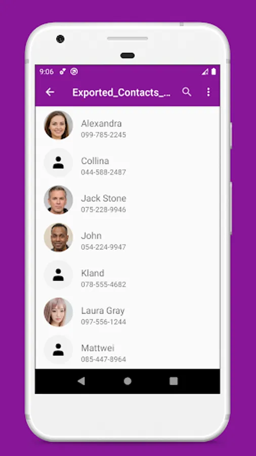Many of us have old backups from previous phones in vcf file format, now it's not a problem. Just open the program, navigate to file, and on the contacts list screen export all of the contacts to the phone memory or Google account.