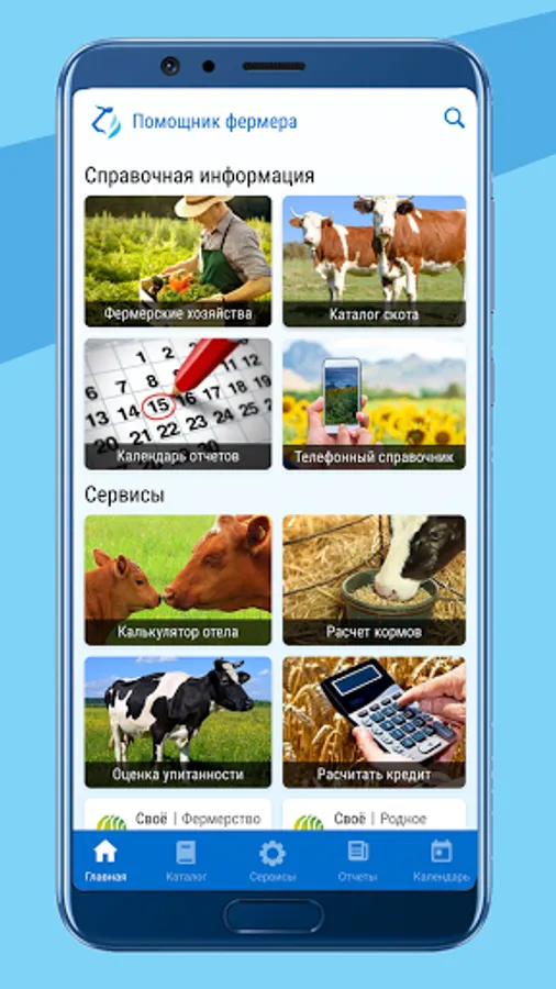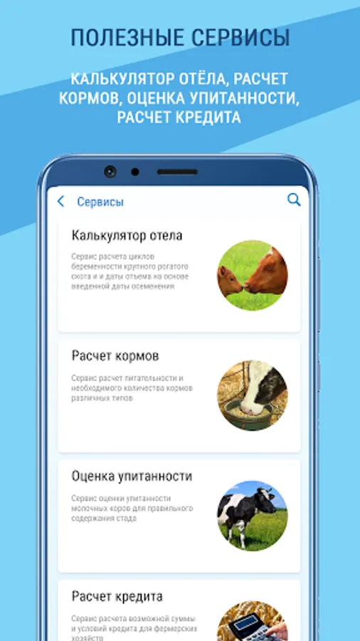 Auxiliary services and calculators implemented in the application will help you calculate the calving date, feeding rates and assess the fatness of cattle, as well as calculate a loan for agricultural needs.