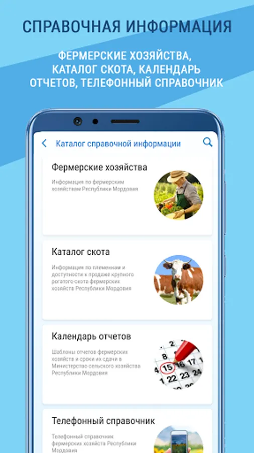 A mobile application for farmers that allows users to get reference information on farmers, a livestock catalog, a calendar of reports and phone numbers of specialists from agricultural organizations of the Republic of Mordovia.
