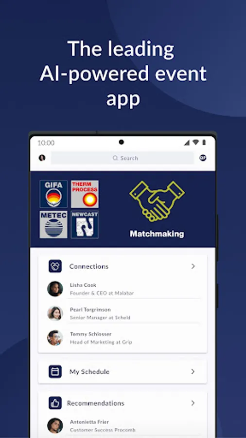 The self-learning matchmaking app selects the most relevant participants for you in order to start networking, arrange appointments and get to know trade fair participants. Every time you use the app, your contact recommendations will get more and more precise because of our self-learning system.