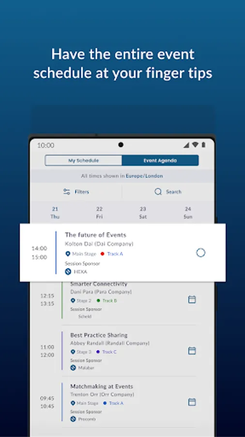 Agenda: View the full agenda and related information, such as session time, room number and speaker information.