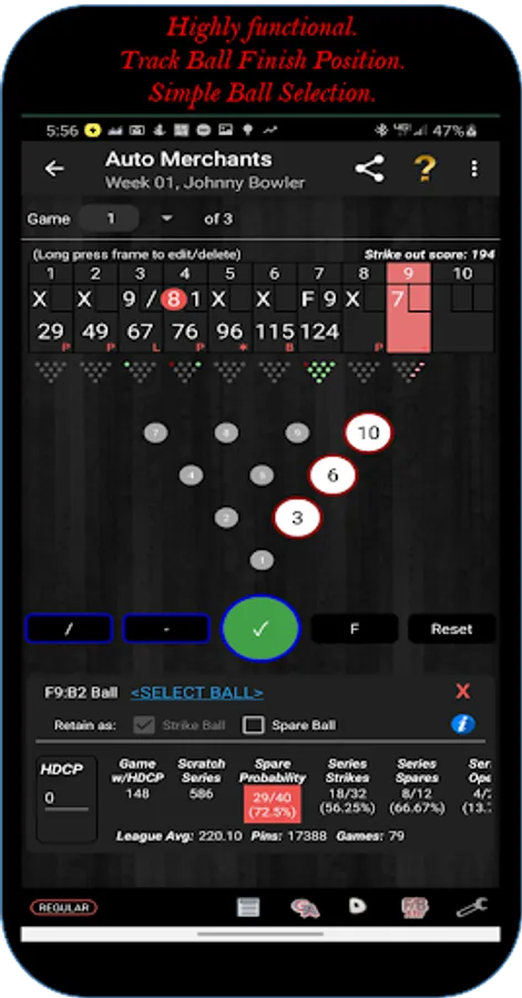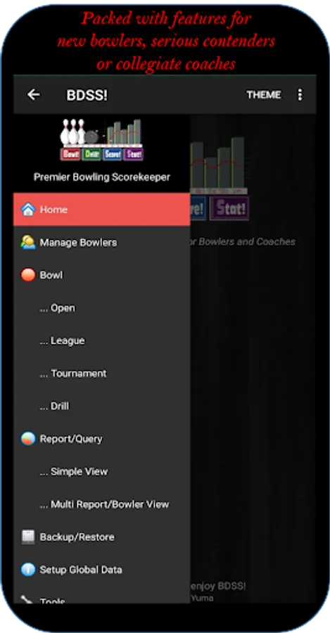 Premier Bowl Scorekeeper (aka Bowl, Drill, Score, Stat or BDSS!) is a full-featured bowling score keeper, reporting and metrics app. The app comes complete with everything you’d expect of a typical bowling score keeping app, but also includes a wide variety of advanced features for the serious bowler, youth leader, college coach, or recreational bowler.