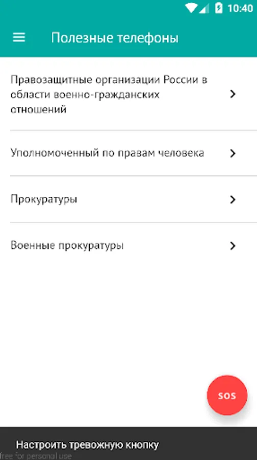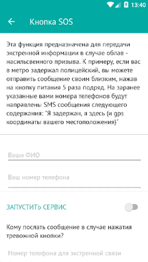* "Safety button" - a special feature that will allow you to urgently and discreetly send a text message to relatives in case you are detained illegally and try to send the army in a single day.