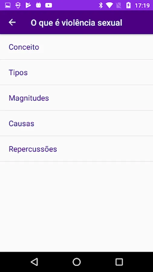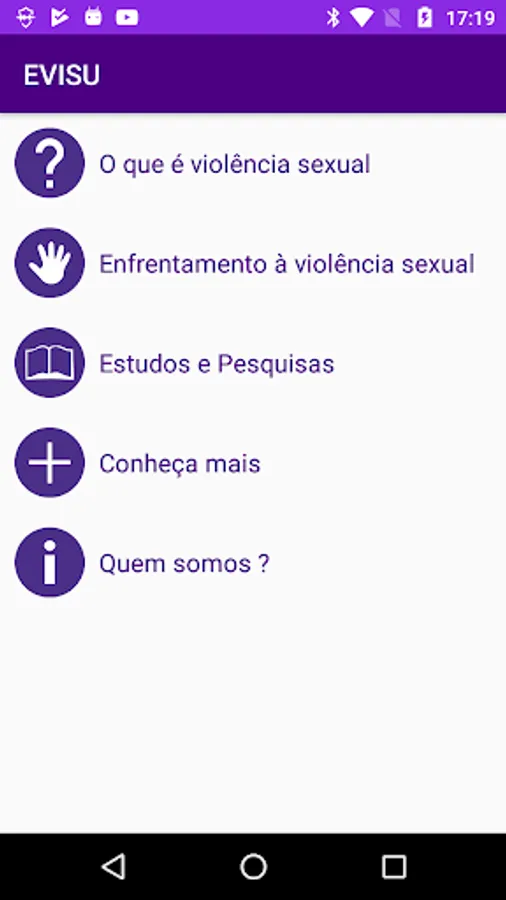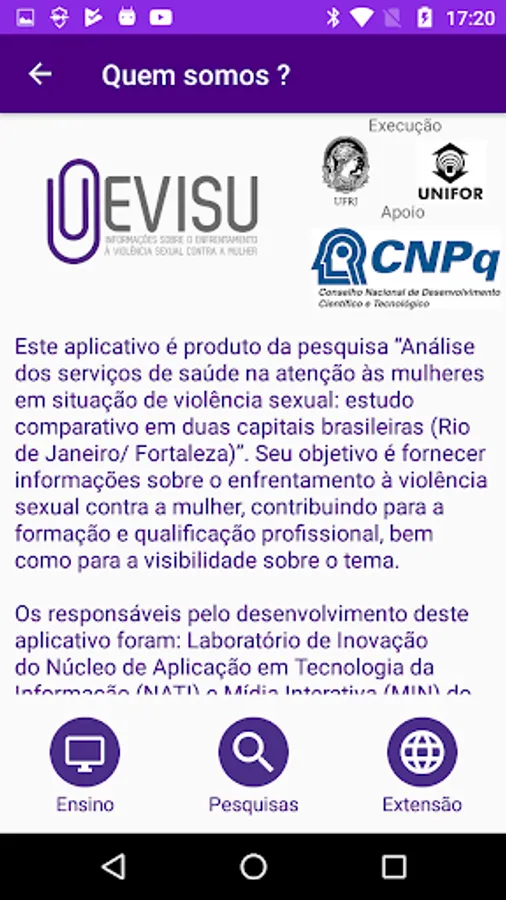 This app is a product of the research “Analysis of health services in the care of women in situations of sexual violence: a comparative study in two Brazilian capitals (Rio de Janeiro / Fortaleza)” through the partnership between the Federal University of Rio de Janeiro, the University Fortaleza and FUNCAP (Cearense Foundation to Support Scientific and Technological Development). Its objective is to provide information on the fight against sexual violence against women, contributing to the professional formation and qualification, as well as to the visibility on the subject.