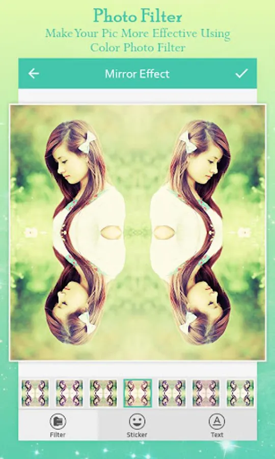 ⇒ Edit your mirror effected pic with common image editing tools like color photo filter, add text, stickers and many more.