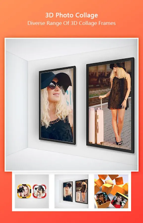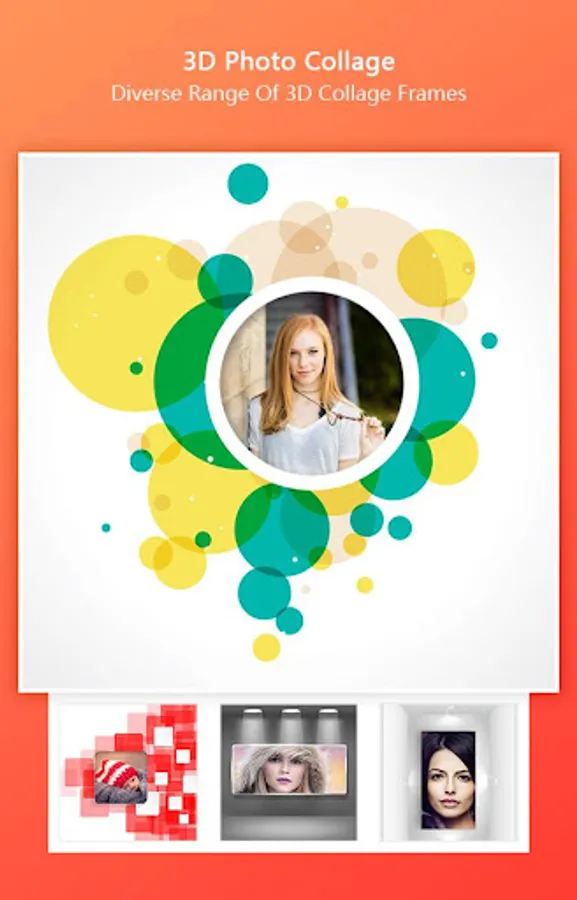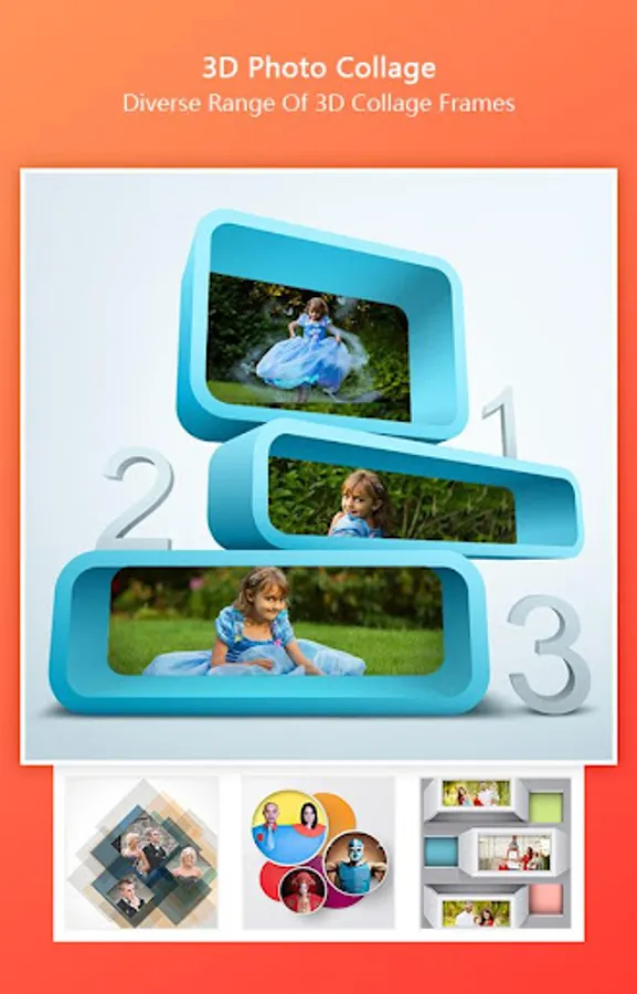 3D Photo Collage Editor is an application with 3D collage layout and frames. This application is introduced with new concept of photo collage using various range of 3D shapes for collage. You can make your multiple pictures frame in just two step using 3D Shapes.