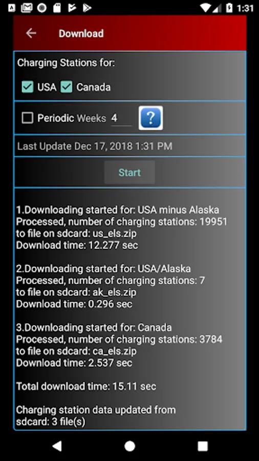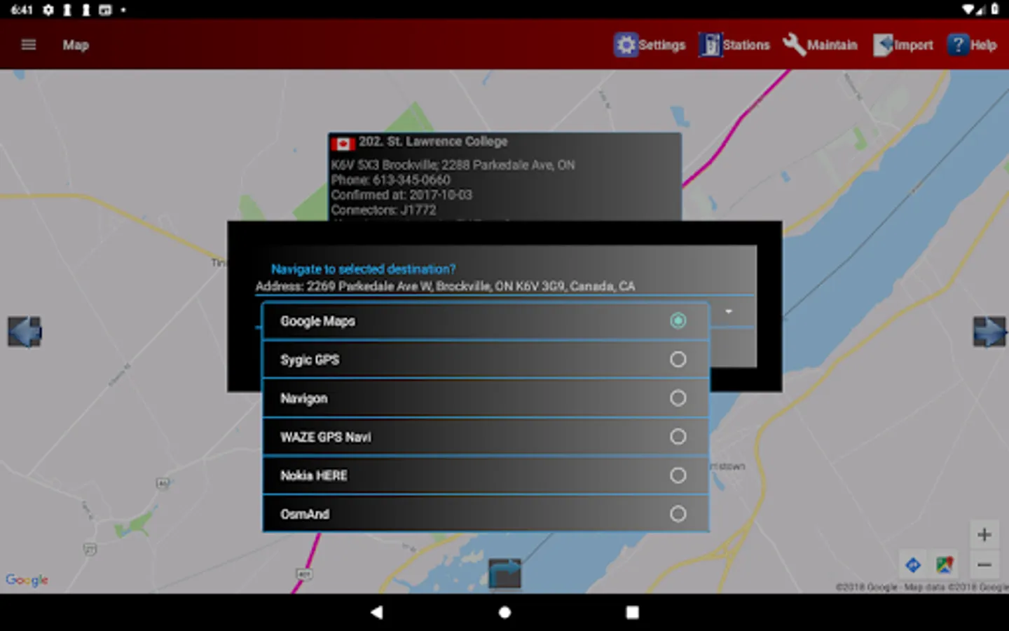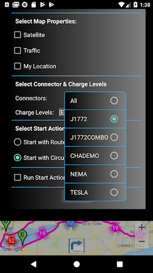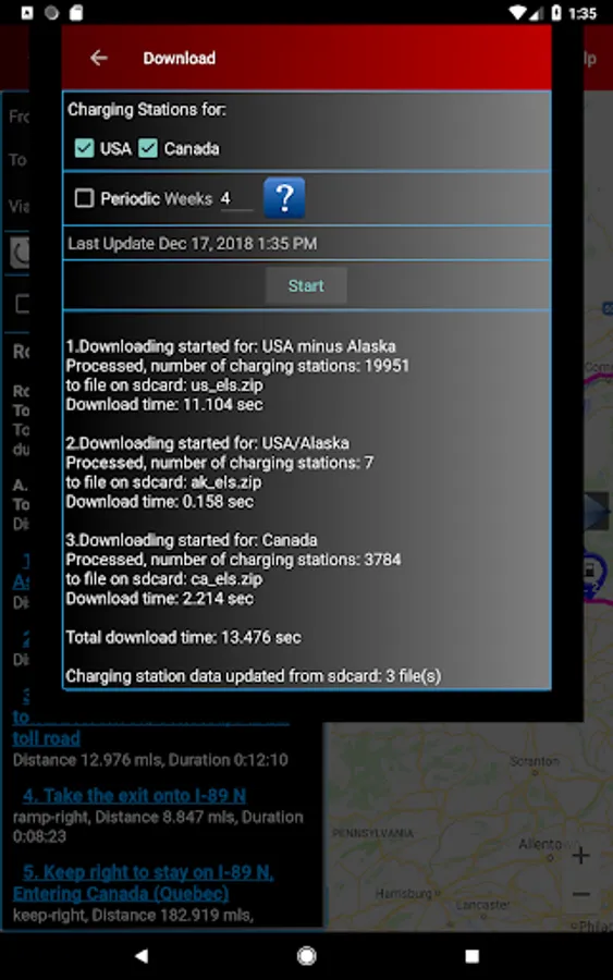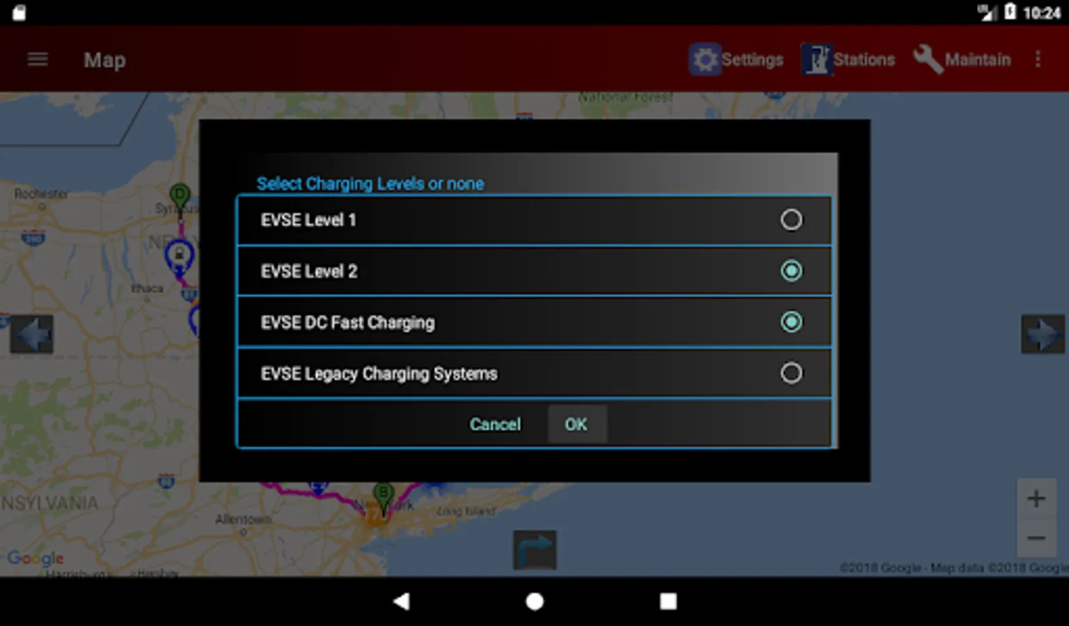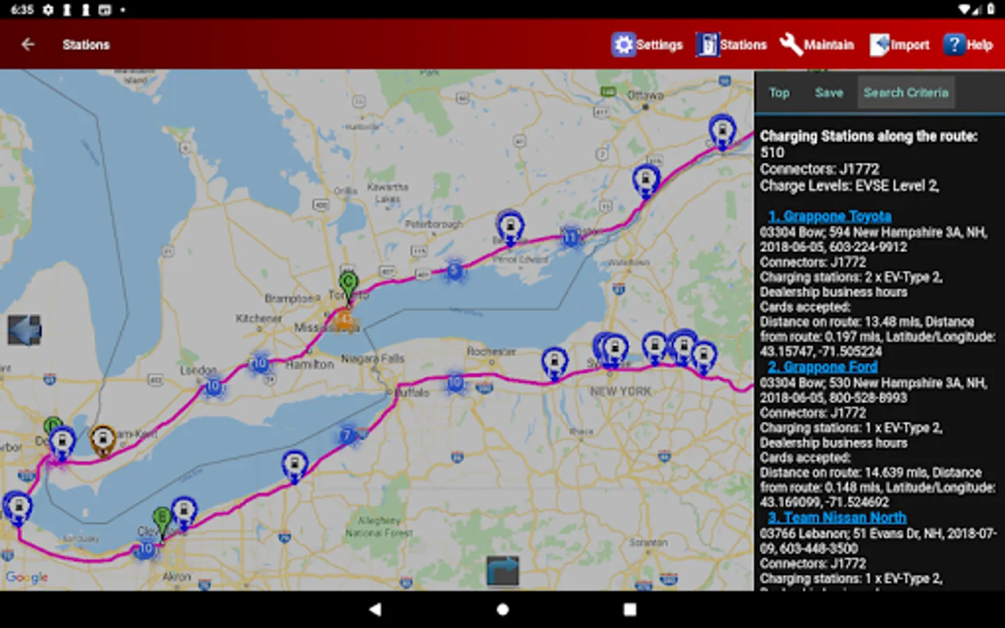 EV Station Finder USA&CAN is an Android application for USA and Canada, which calculates a route and shows electric loading stations with electric vehicle supply equipment (EVSE), along this route with a given maximum distance to the route or within a circle with a given radius around a location. The location may be obtained by the location service of the phone or an address entered by the user.
