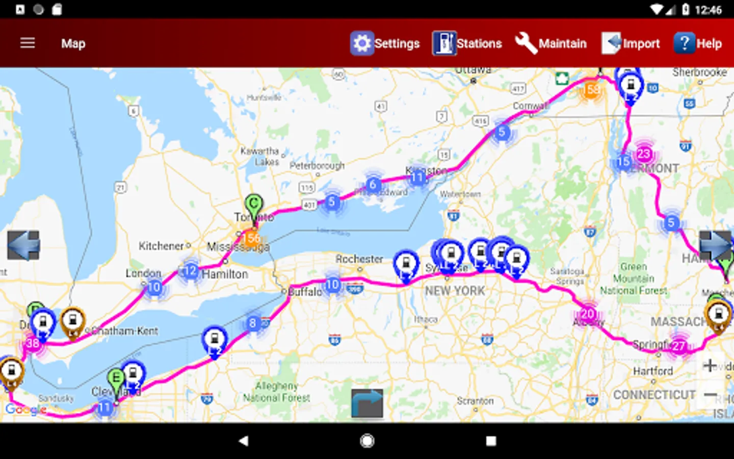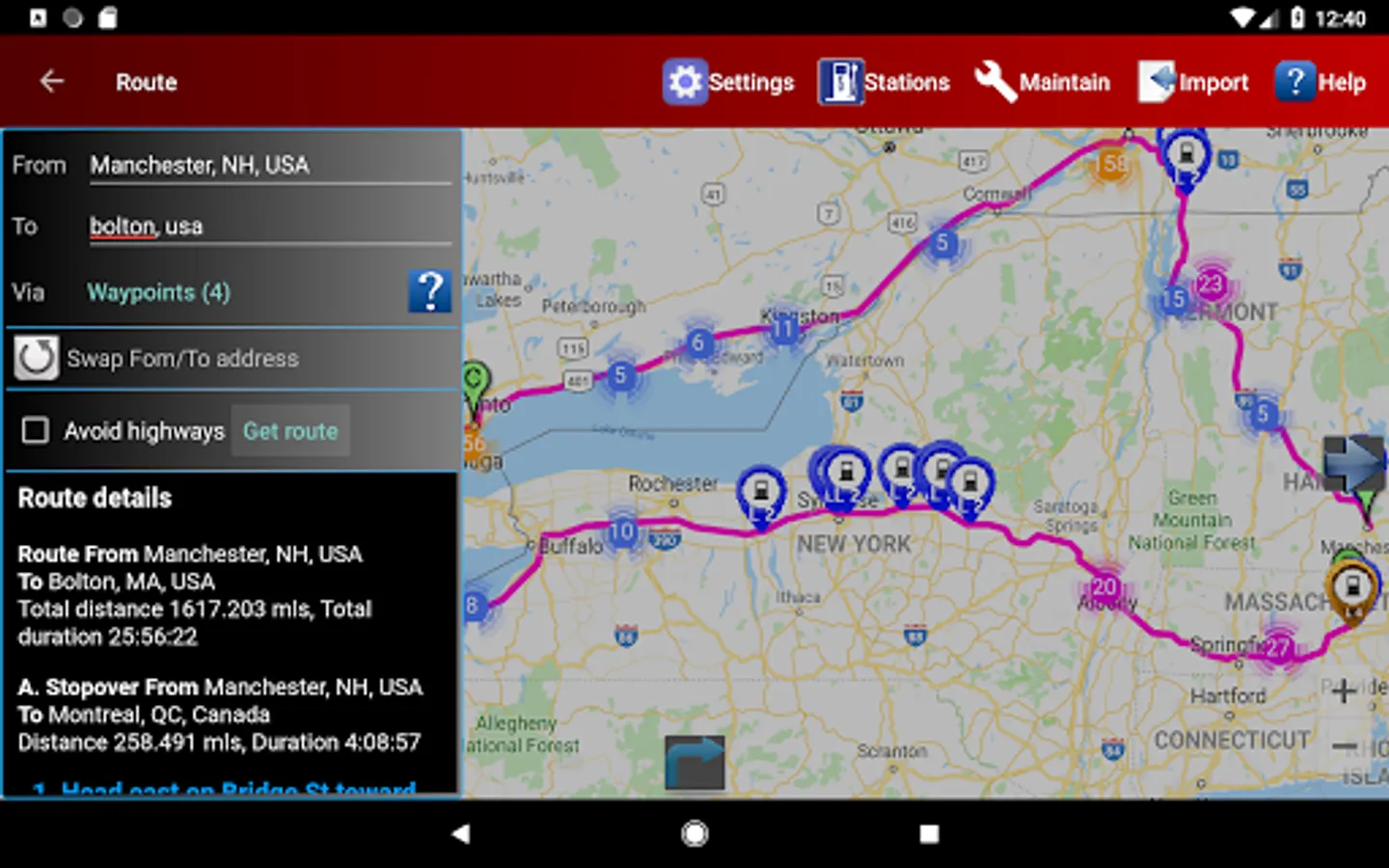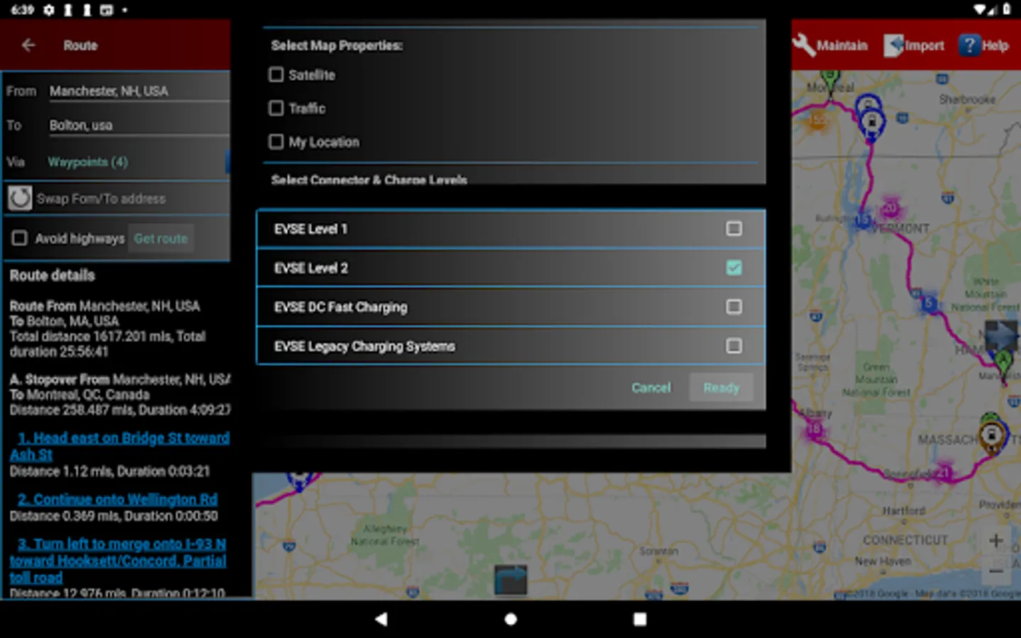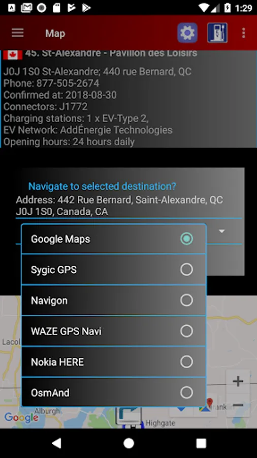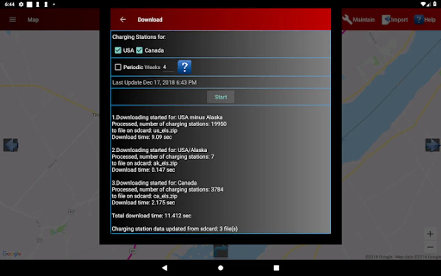 EV Station Finder USA&CAN is an Android application for USA and Canada, which calculates a route and shows electric loading stations with electric vehicle supply equipment (EVSE), along this route with a given maximum distance to the route or within a circle with a given radius around a location. The location may be obtained by the location service of the phone or an address entered by the user.