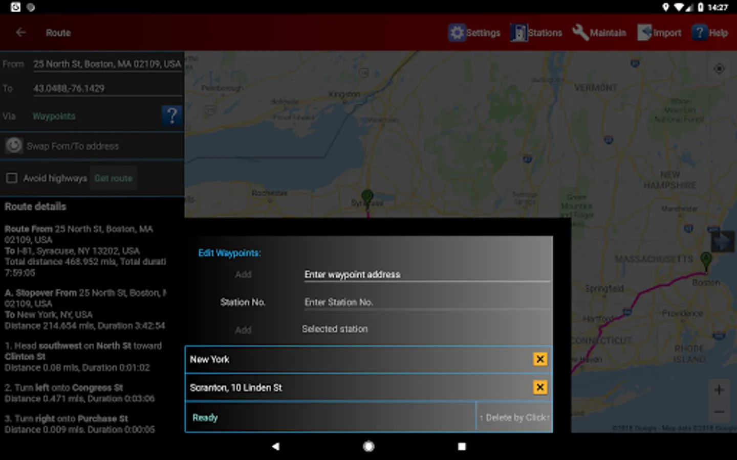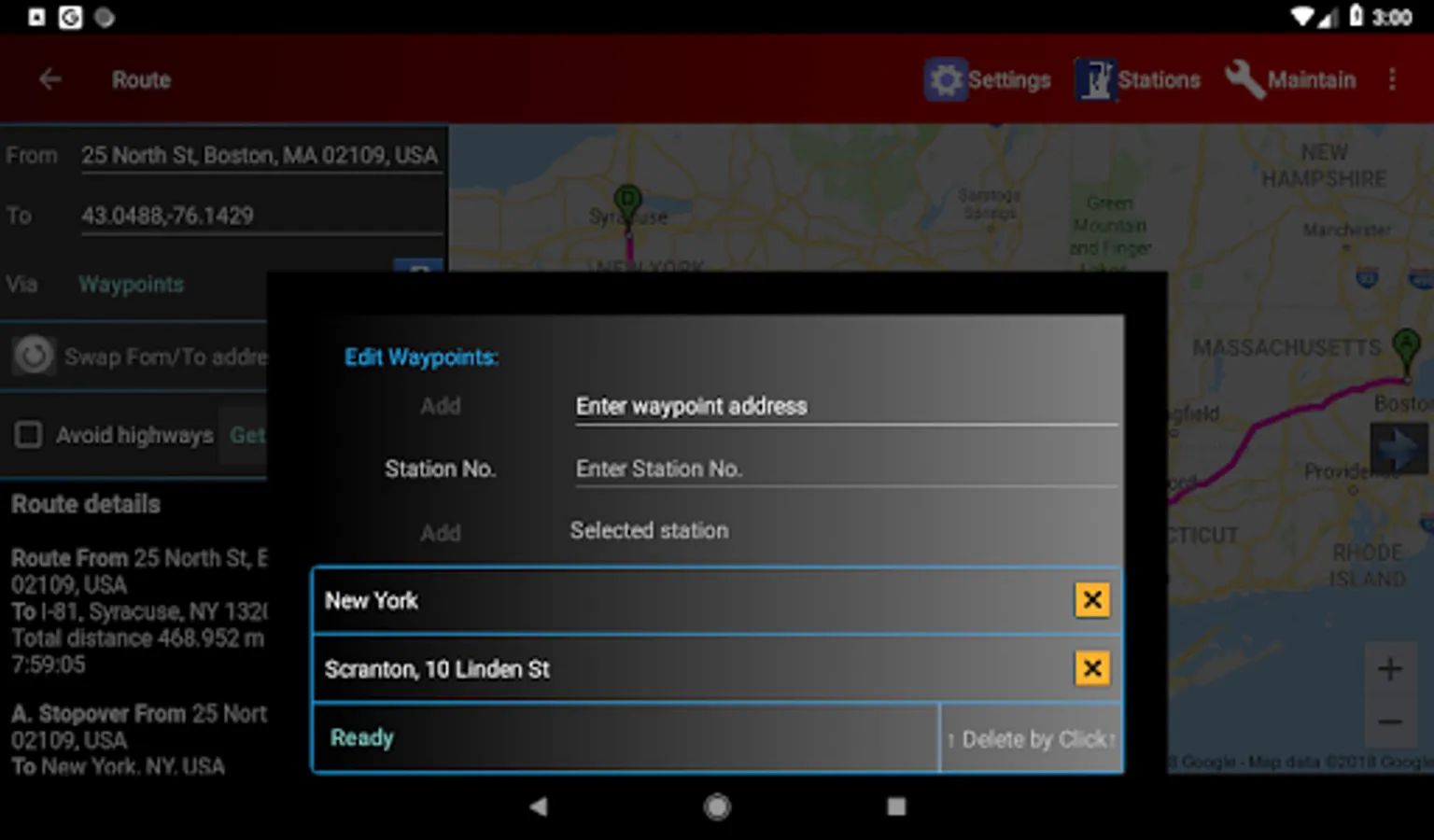 The To Address of a route request is now the final end address without waypoints separated by semikolon. Waypoints can be added in arbitrary order to a list. If stations are already found, a selected station can be added to the list. The next route request shows the loop way from the route to this station.