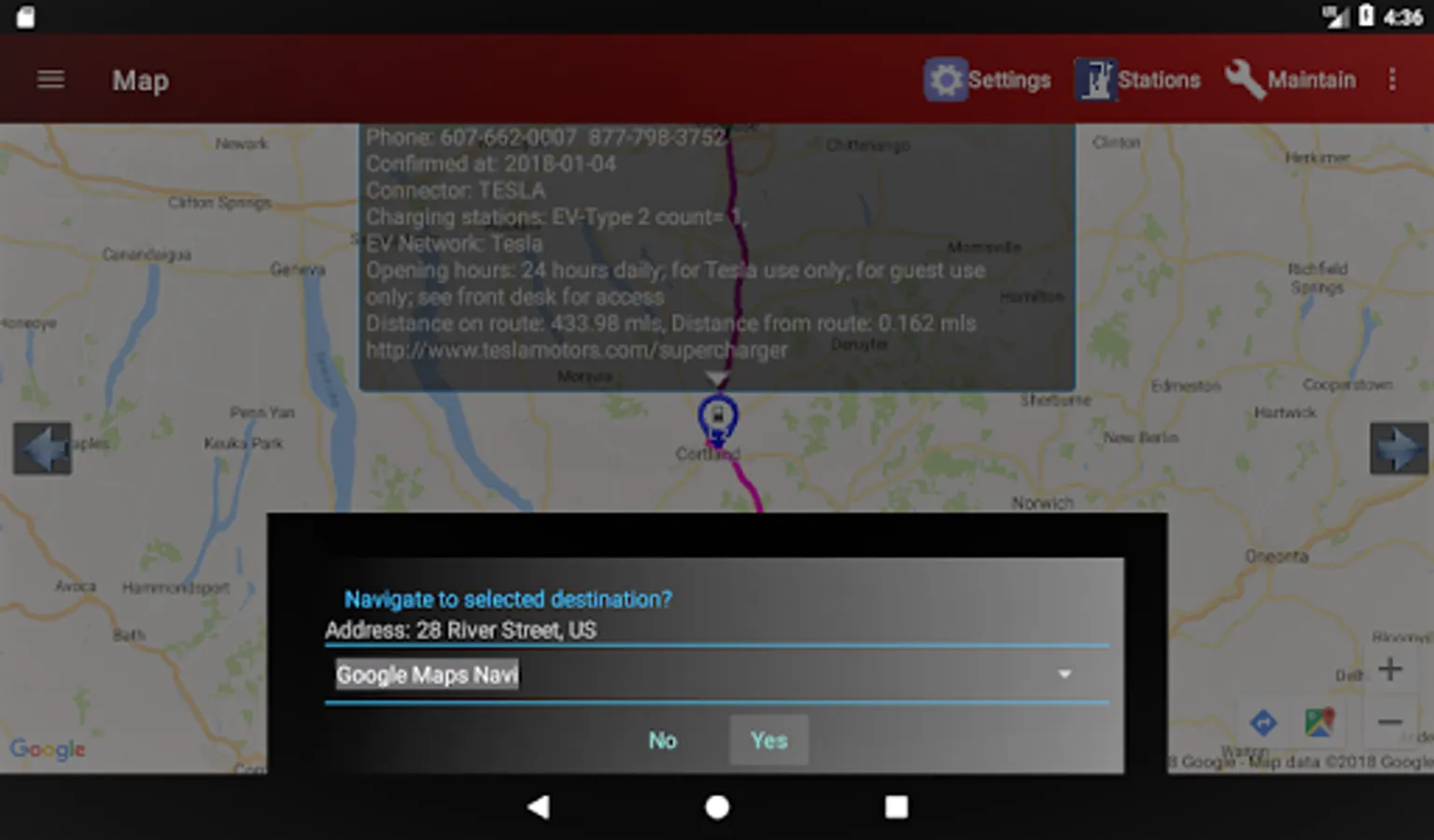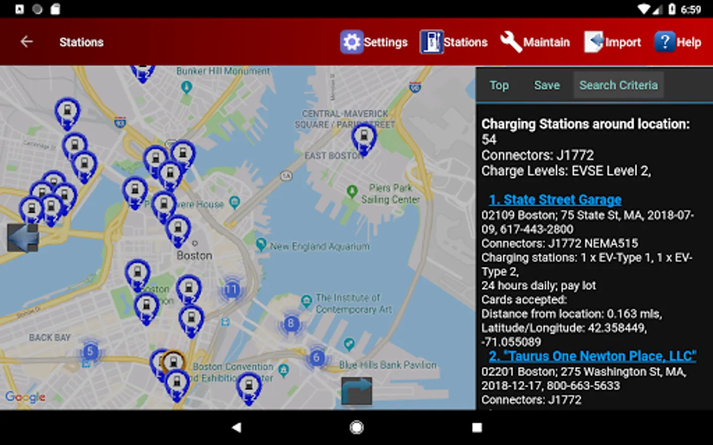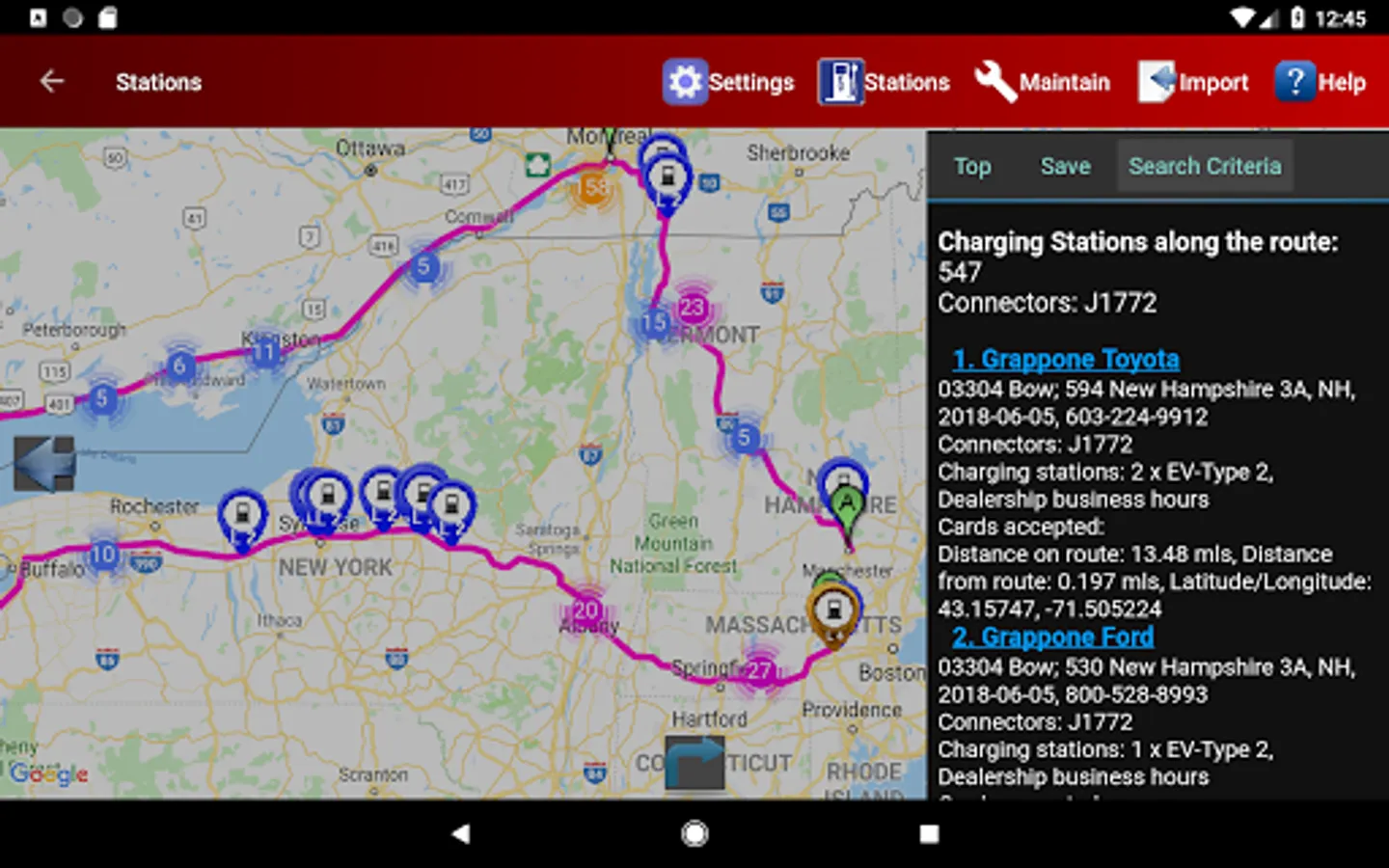 EV Station Finder USA&CAN is an Android application for USA and Canada, which calculates a route and shows electric loading stations with electric vehicle supply equipment (EVSE), along this route with a given maximum distance to the route or within a circle with a given radius around a location. The location may be obtained by the location service of the phone or an address entered by the user.