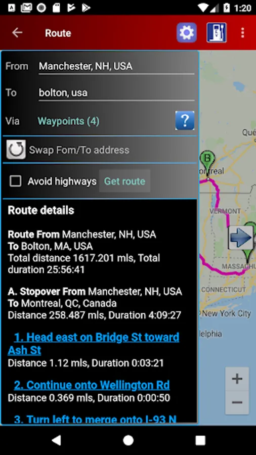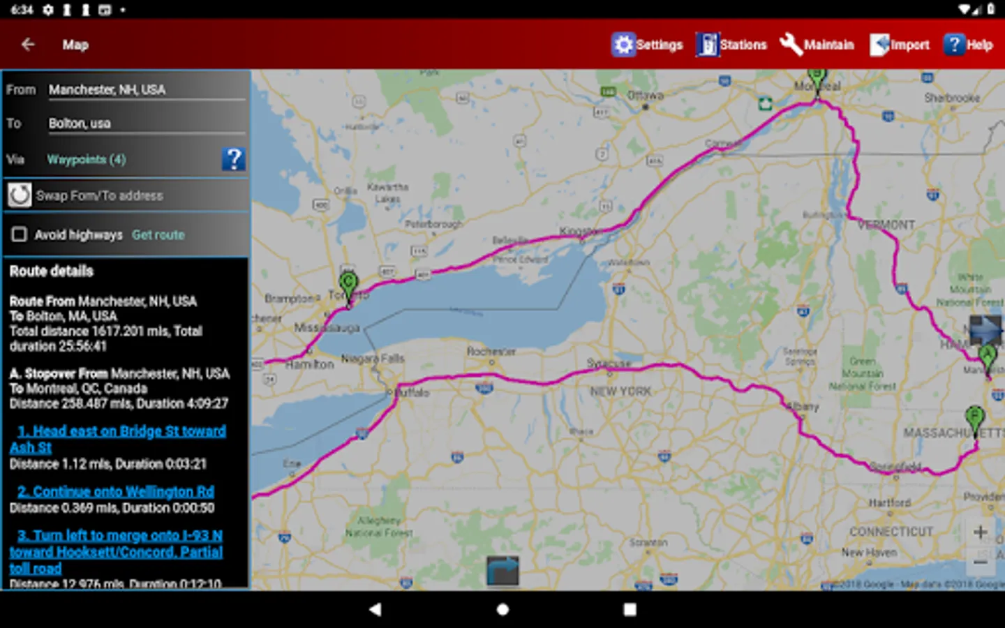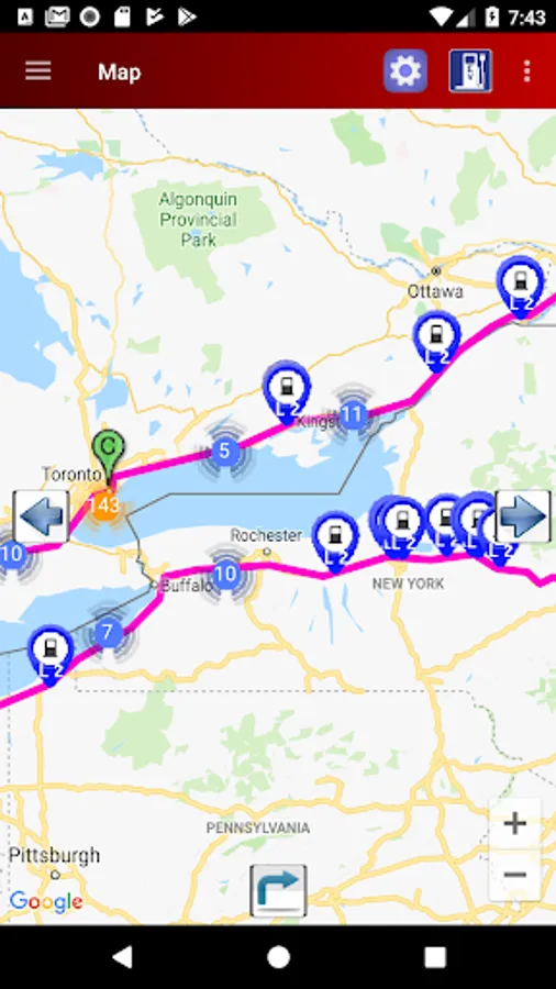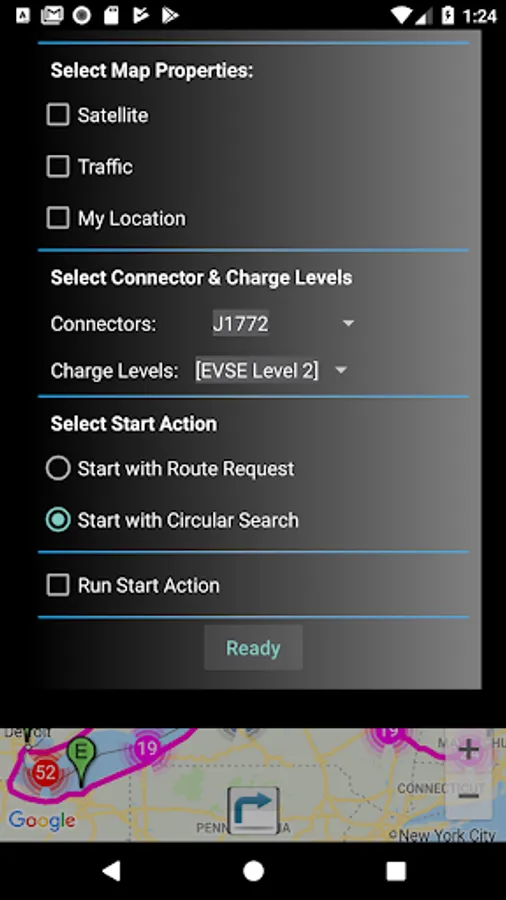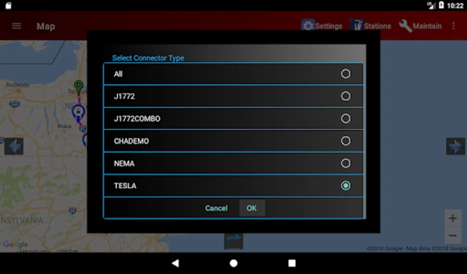 EV Station Finder USA&CAN is an Android application for USA and Canada, which calculates a route and shows electric loading stations with electric vehicle supply equipment (EVSE), along this route with a given maximum distance to the route or within a circle with a given radius around a location. The location may be obtained by the location service of the phone or an address entered by the user.