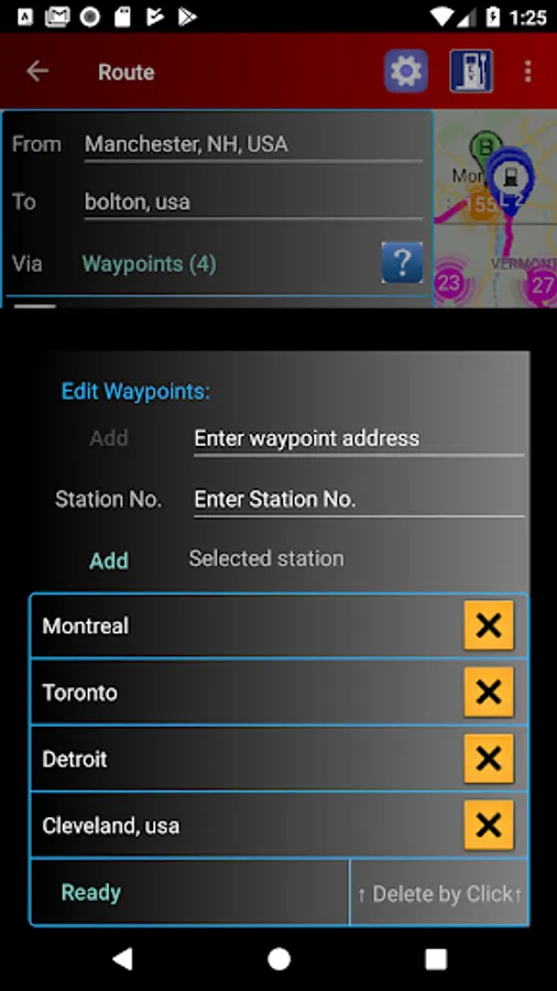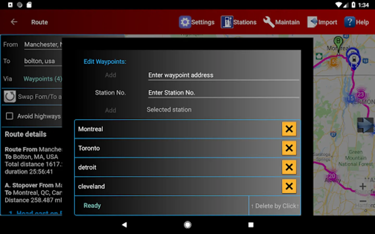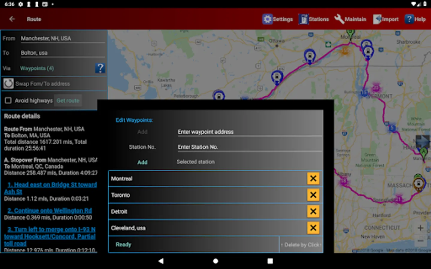 The To Address of a route request is now the final end address without waypoints separated by semikolon. Waypoints can be added in arbitrary order to a list. If stations are already found, a selected station can be added to the list. The next route request shows the loop way from the route to this station.
