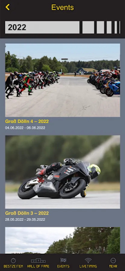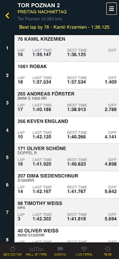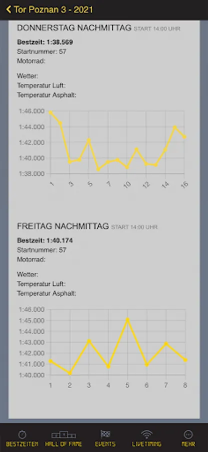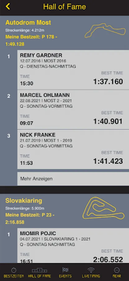The lap times are displayed on the pitboard, which is exactly what happens in the app. Here you can quickly and at a glance call up your previous best times, the live timing, also check all lap times driven individually and of course compare your times in the Hall of Fame with others. In addition, you will find the events you took part in with race reports, individual times and photos of you. There is also information about the racetracks, onboard videos, tips for overnight accommodation, etc.