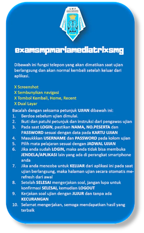 This application was made specifically for Maria Mediatrix SMG Middle School Special Exam activities. run on android devices 6.0 and above