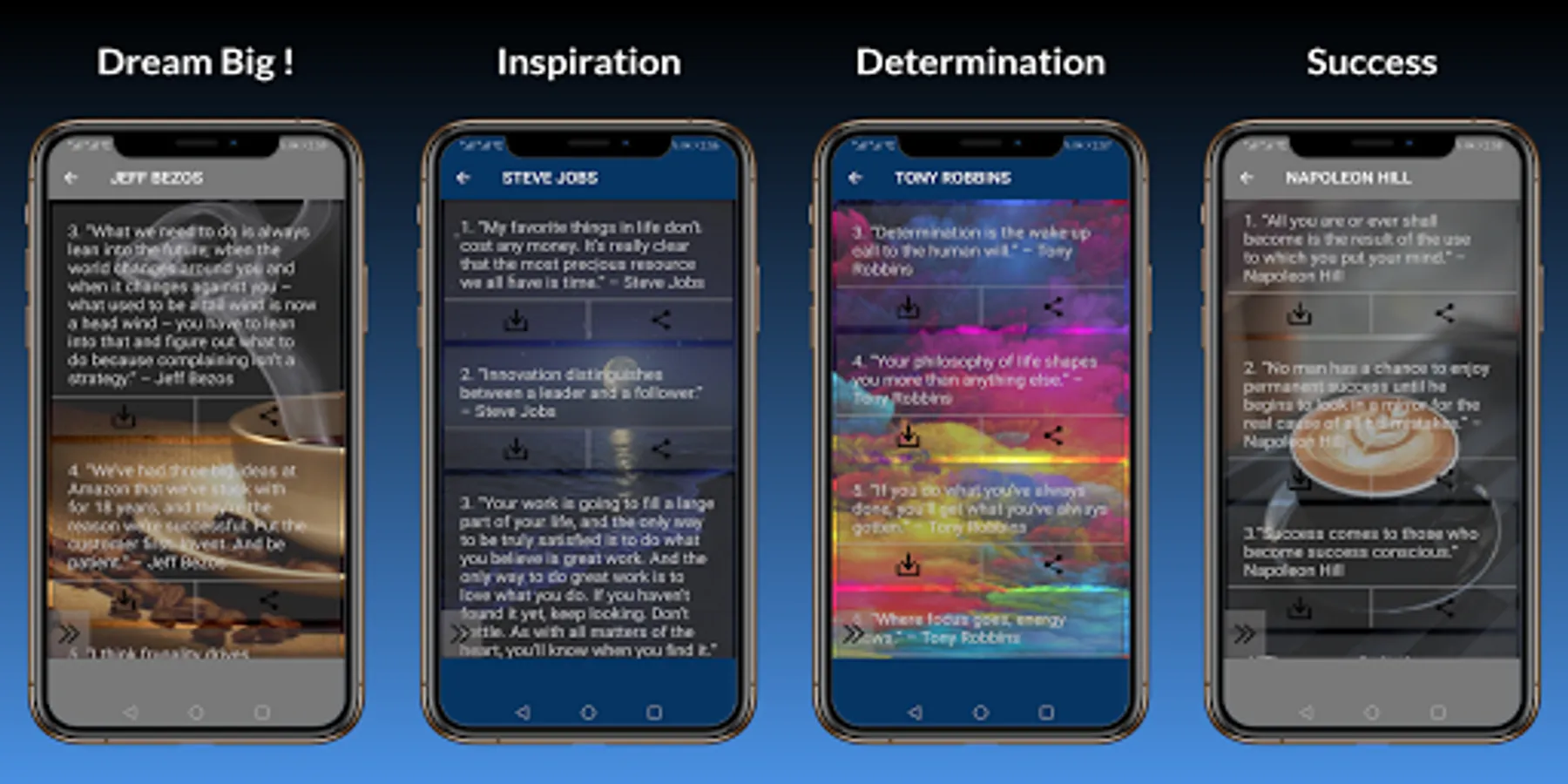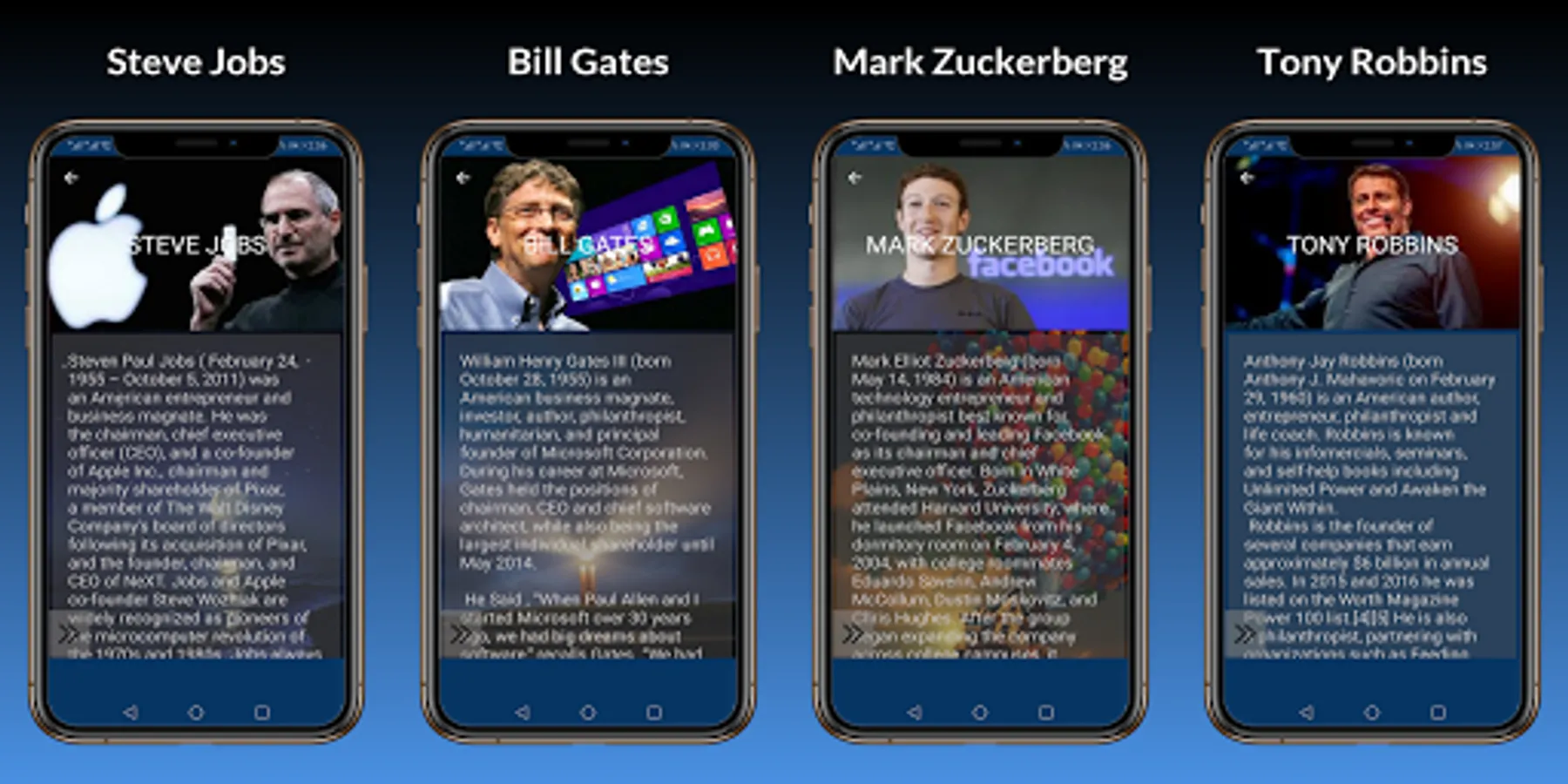 In this App we collect best Success stories and Quotes of all Great Minds people who changed the world by their action.
