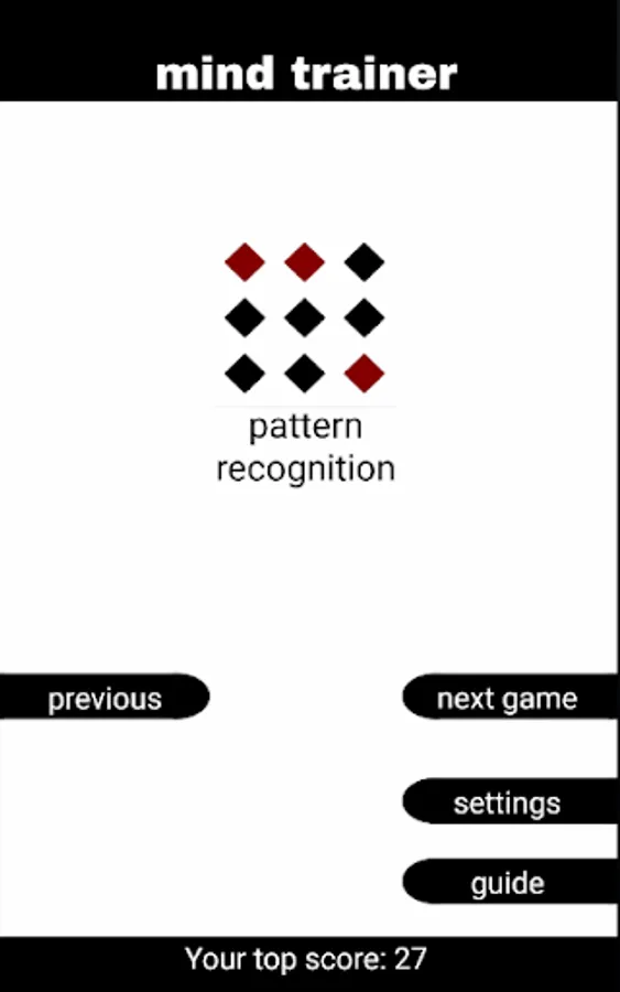 - train your memory in Pattern Recognition game - you need to remember the schema presented on the screen;