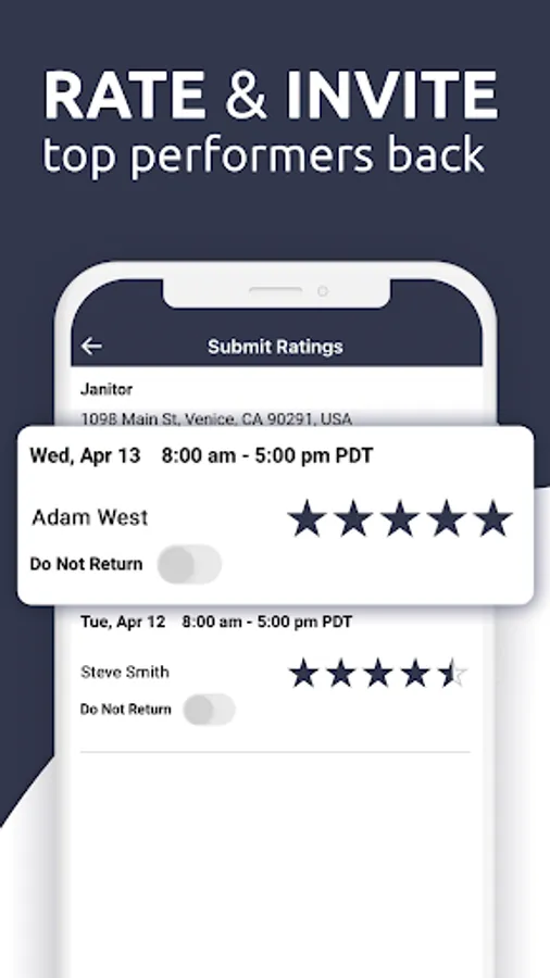 - Submit ratings and hours for workers who have just finished their shifts with you