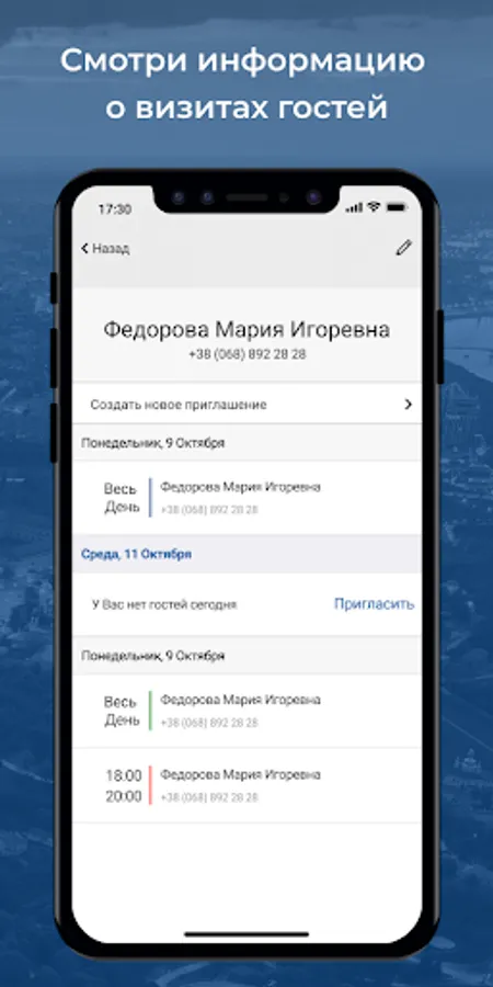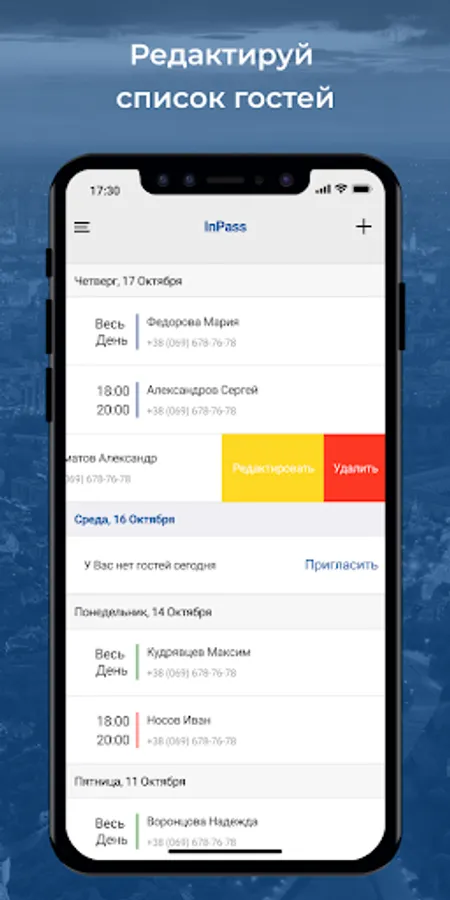 No need to call the guard, go to the site or do other complex actions. Just go to the InPass app and choose the one you want to skip. If the guest is not visiting for the first time, simply activate the pass again. It takes no more than 15 seconds of interaction with your smartphone.