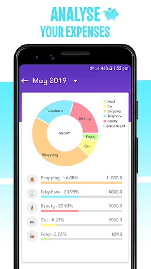 Money manager also displays a chart of your expenses with detailed analysis of your spends across different categories. This helps in tracking your expenses and income.
