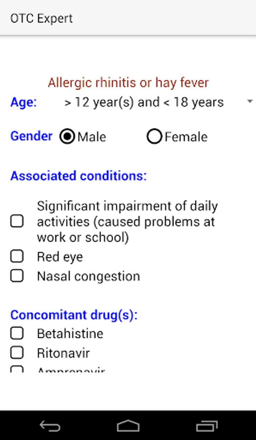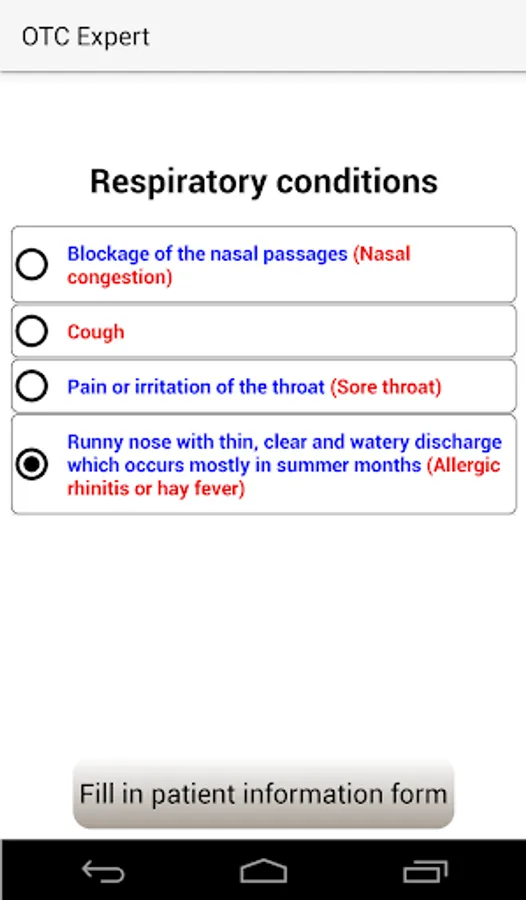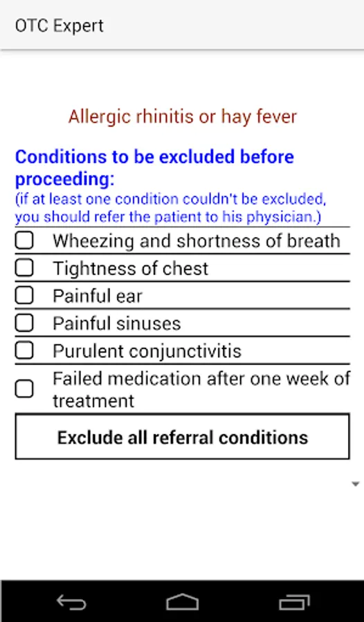 'OTC Expert' is designed in a simple form to help you collect the required information from the patient in order to select the best OTC drug considering contraindications of drugs.