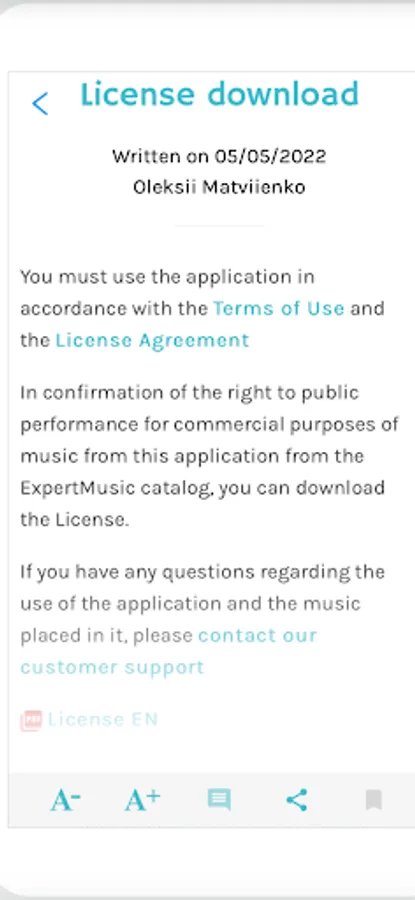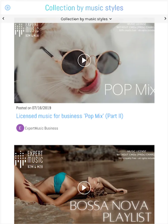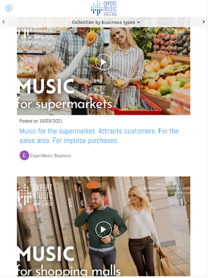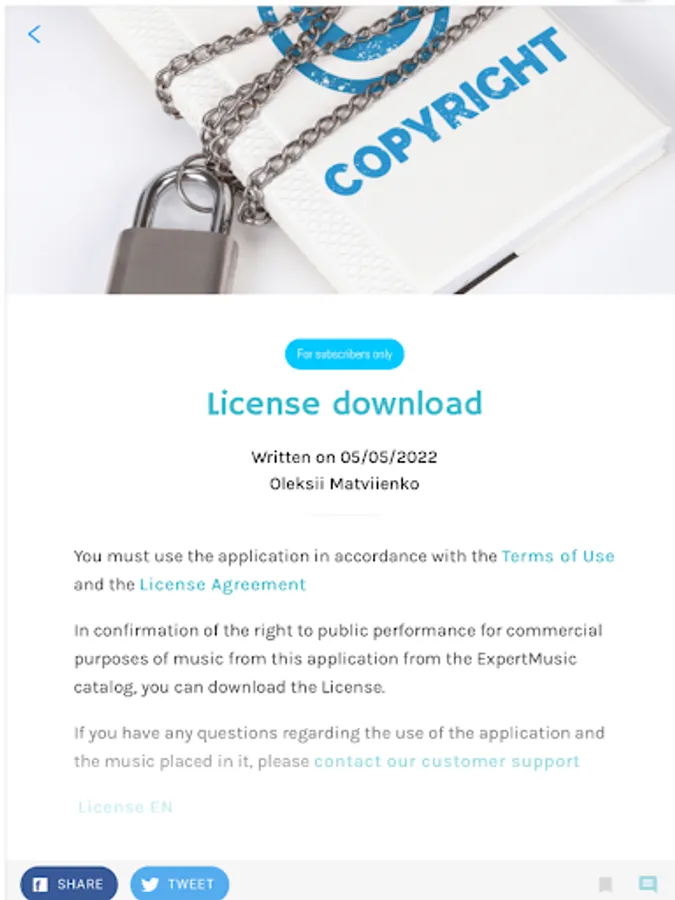 1. License to use music for commercial purposes in public places: cafes, beauty salons, shops, restaurants ... The license can be downloaded directly from the application and hung indoors as proof of the legality of using ExpertMusic music in your business.