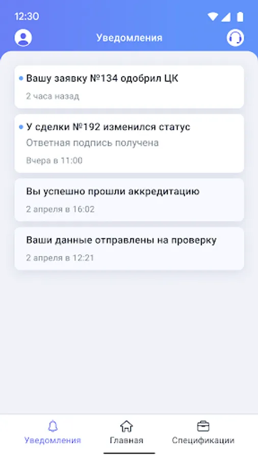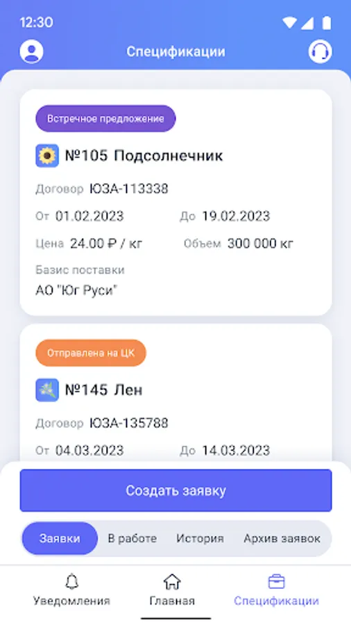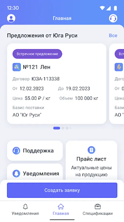 The application is a mobile version of the personal account of the supplier of the South of Rus' (https://cabinet.yugrusi24.rf/login). In this application, the supplier has the opportunity to consider previously created specifications and applications for the sale of his goods to the Yug Rus company.