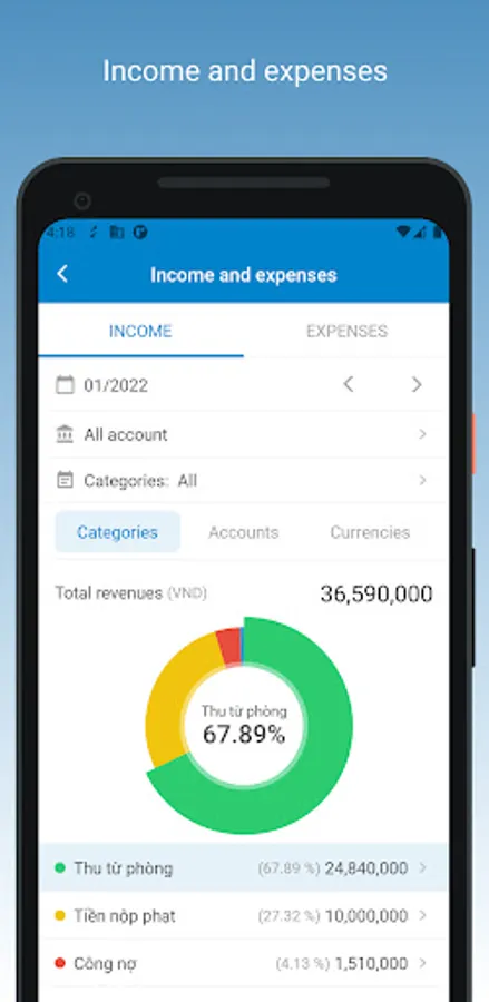 The chart of room capacity, visual revenue on the hotel management application ezCloudhotel App helps hotel owners to understand business results by month, easy to compare with the previous month to make effective hotel operation decisions. fruit.