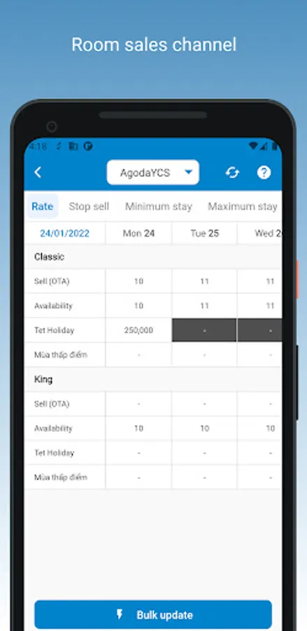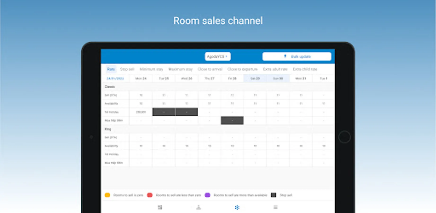 Allows hotel owners to update available rooms on OTA channels right on their mobile phones (for hotels that use ezCms - Integrated channel management software 200+ OTA channels).