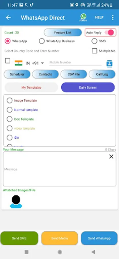 Create WhatsApp chatbots, auto-reply to calls and messages on text/WhatsApp, send bulk messages, schedule WhatsApp messages, Business caller id, Daily Banner & enjoy a suite of additional features.