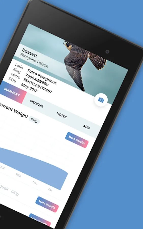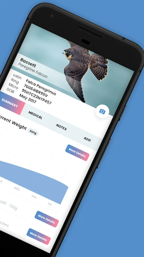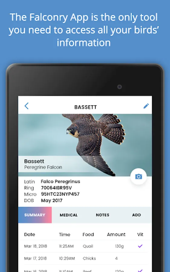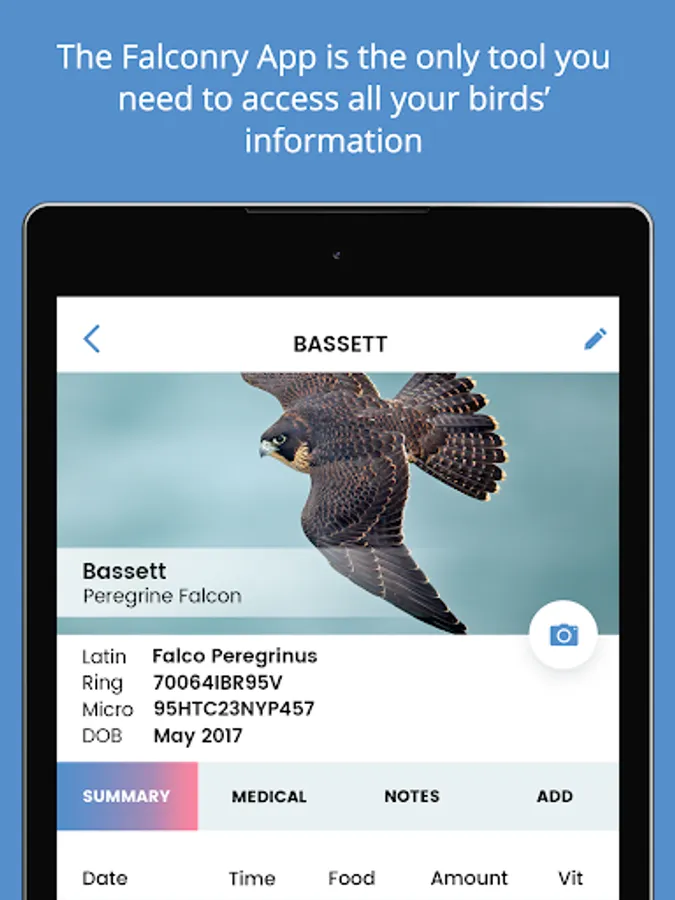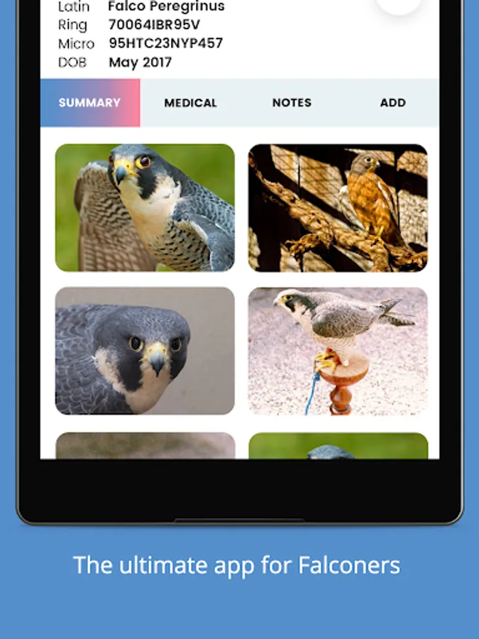 Falconry App brings comprehensive hawk data to your fingertips with the tap of a screen. Specifically designed for simple operation The Falconry App enables you to record and recall data instantly on all your birds of prey.