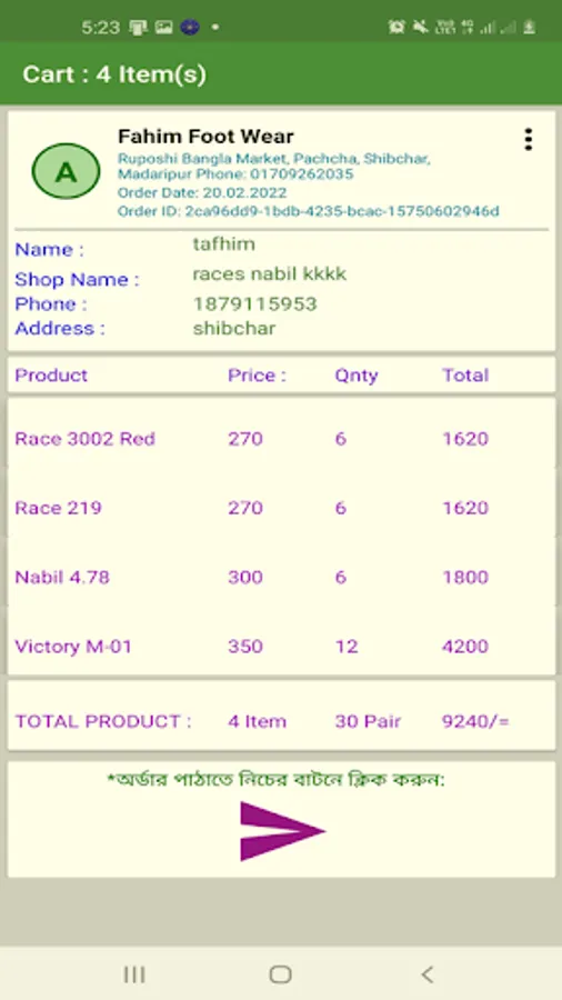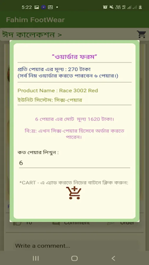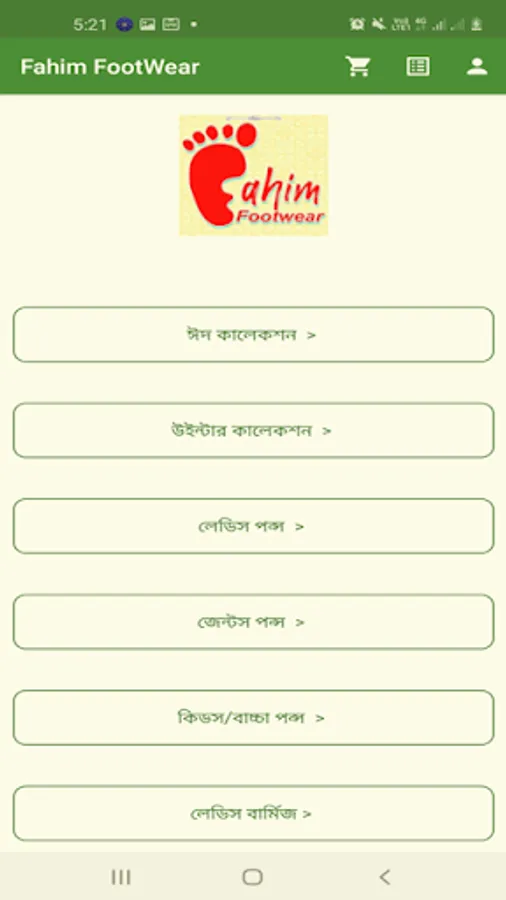 এ্যাপে বিভিন্ন ক্যাটাগরীর আলাদা আলাদা বাটন আছে। যে বাটনে ক্লিক করবেন, ঐ বিভাগের সবগুলো জুতার ছবি পেয়ে যাবেন। এরপর Cart এ ক্লিক করে যোগ করুন। এবং অর্ডার করুন। পাইকারী জুতা কেনা এখন খুব সোজা, ইনশাআল্লাহ।