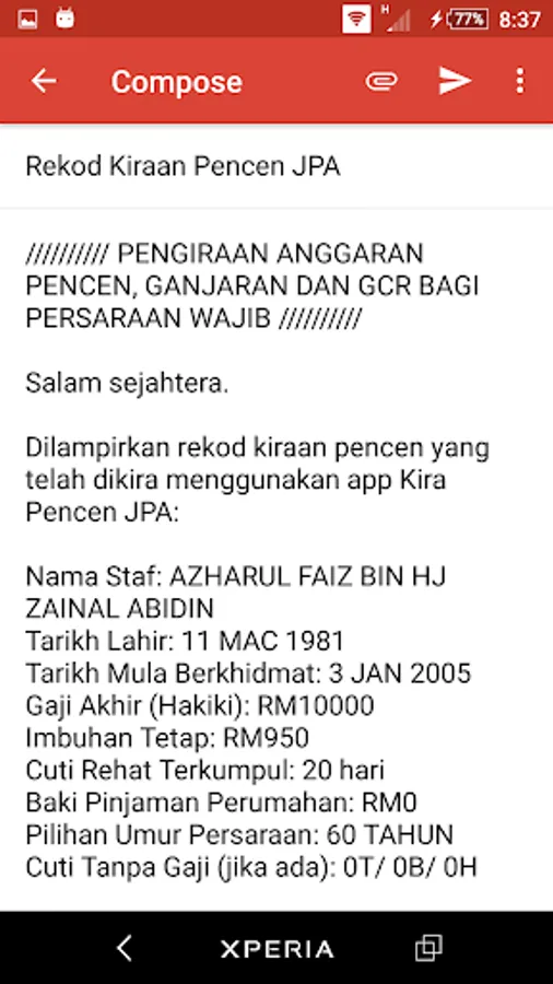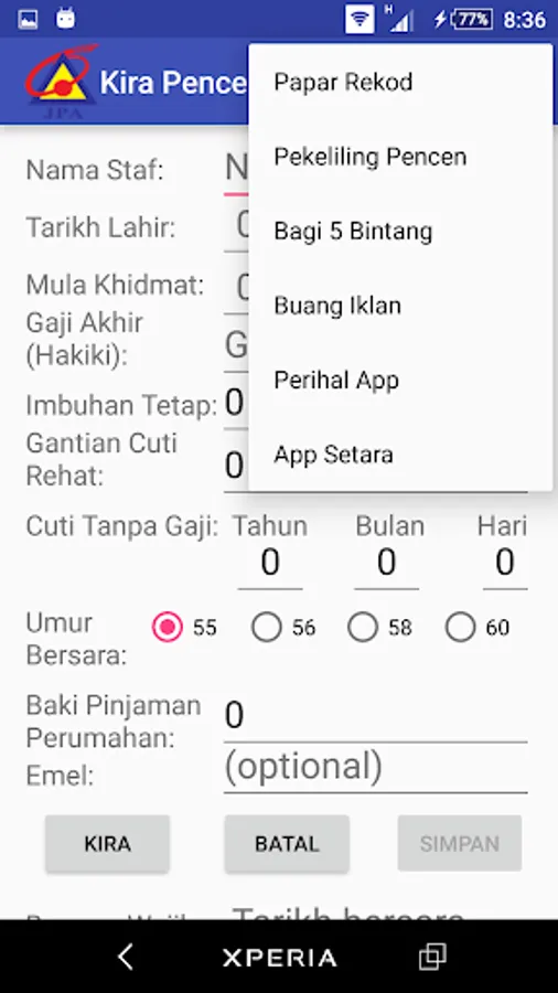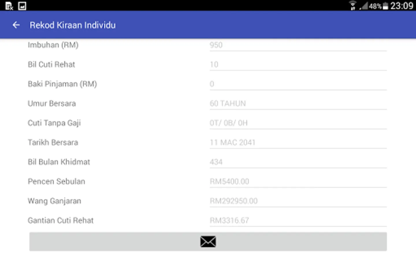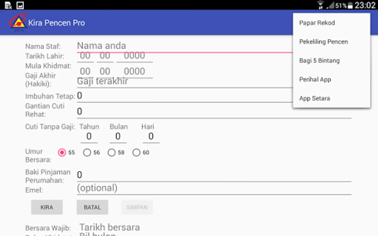 Apps kalkulator kiraan pencen ini dibangunkan menggunakan formula pengiraan persaraan wajib sedia ada. Namun, ia cuma anggaran sahaja untuk memudahkan semakan kiraan menggunakan komputer.