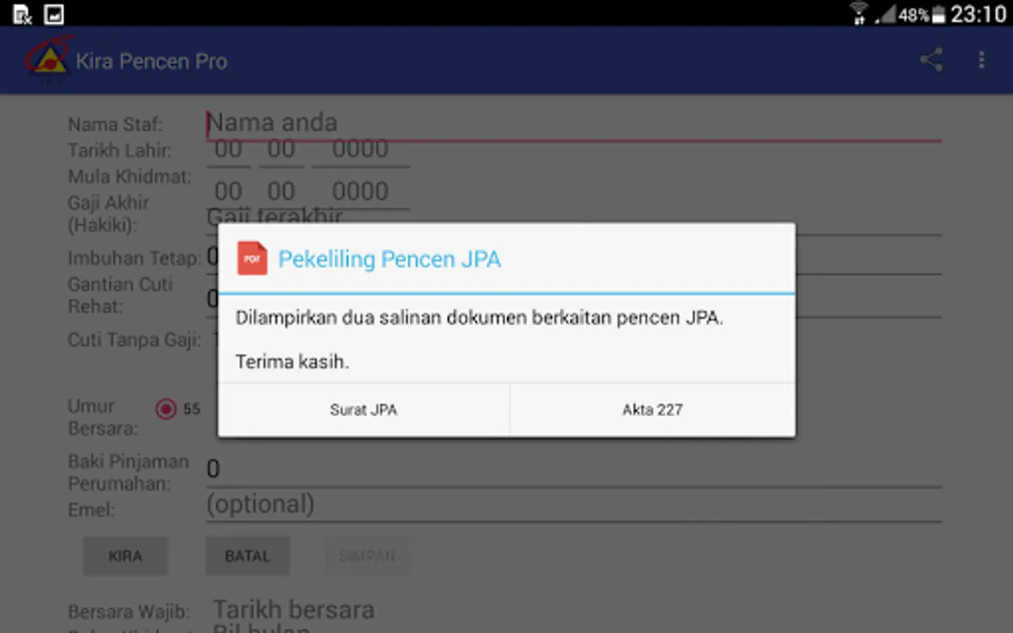 Pekeliling Pencen Akta 227/Akta Pencen 1980 disediakan dalam app ini. Surat JPA bertarikh 17 Oktober 2016 dengan tajuk Tanggungjawab Menyelesaikan Hutang Kepada Kerajaan juga diselitkan dalam app ini.