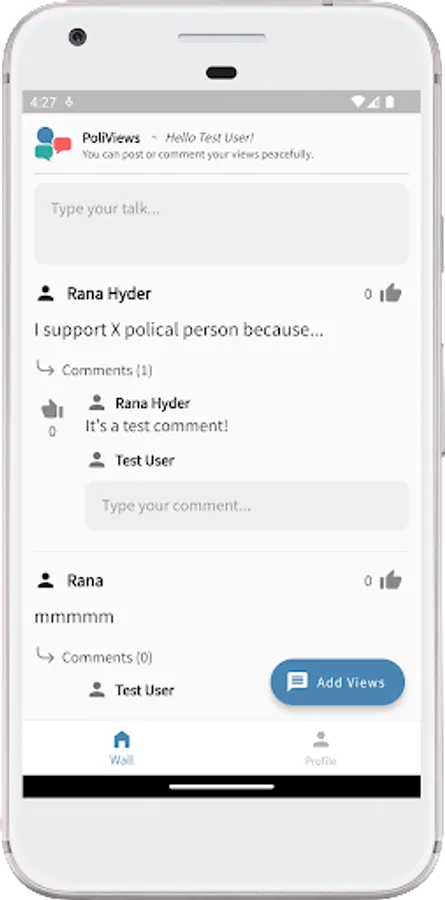 In PoliViews you can express your views in posts and comments with other people peacefully.