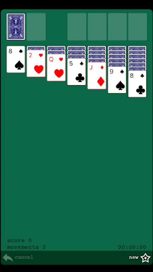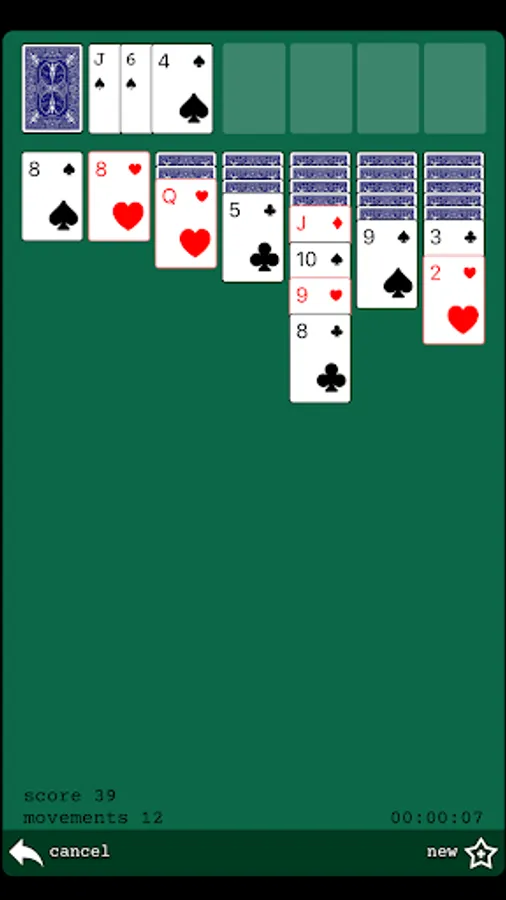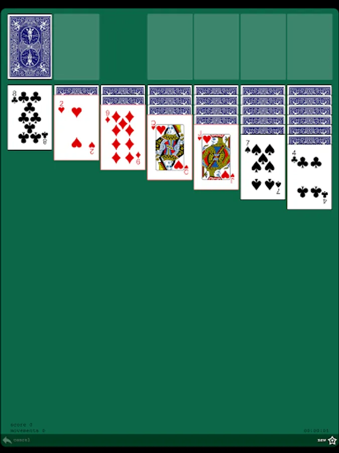 The purpose of the solitaire is to fill the 4 foundations with suites of ascending cards (ace, two, three, four, five, six, seven, eight, nine, ten, valet, lady and king) and of the same family (clover, spades, diamonds or hearts).
