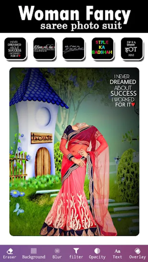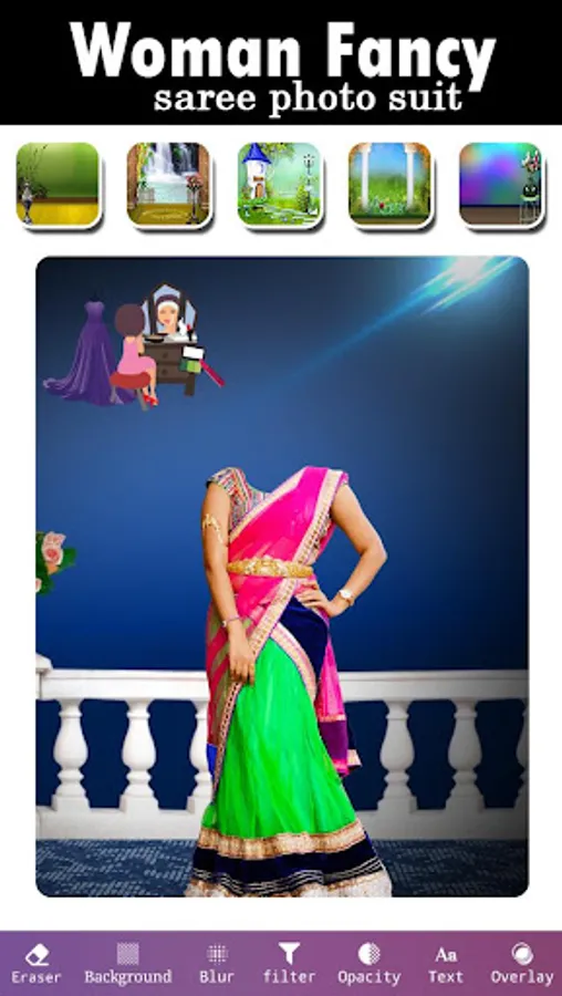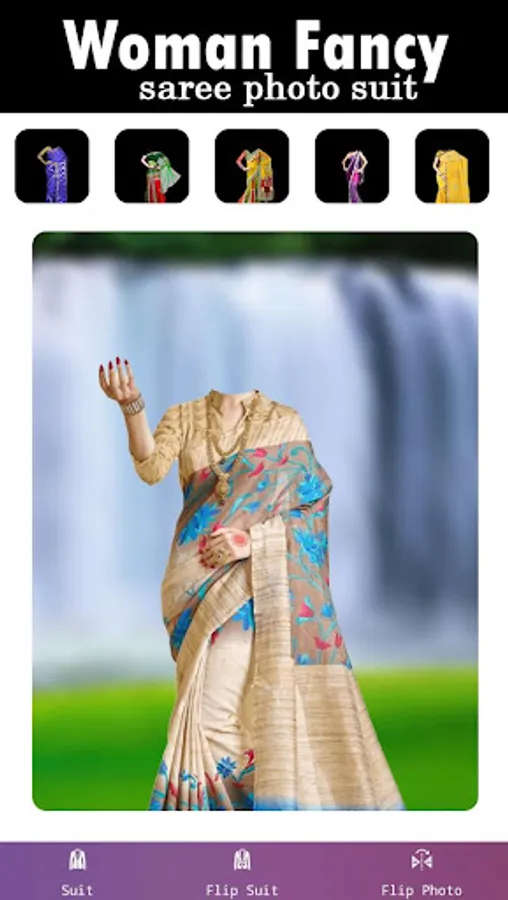 Select suit and select photo from gallery and cut photo and set photo into suit and eraser selected photo and suit and set background. Here you have a chance, saree photo suit app provide different type of woman saree with different suit and size and check how you will look with a ladies saree suit on??