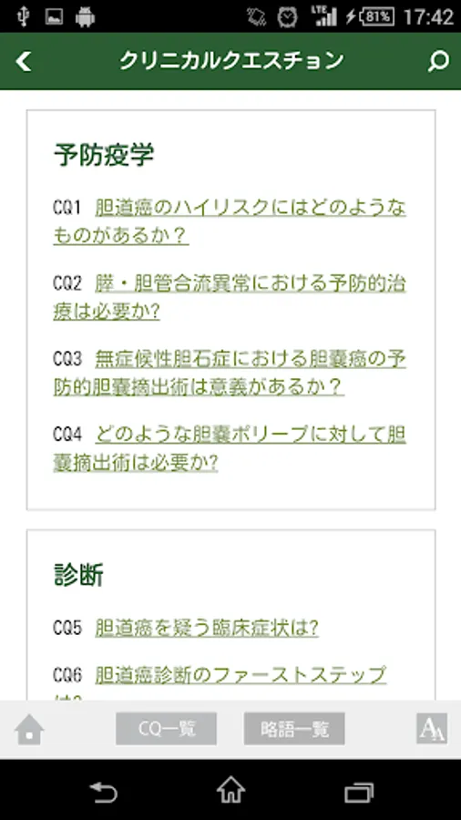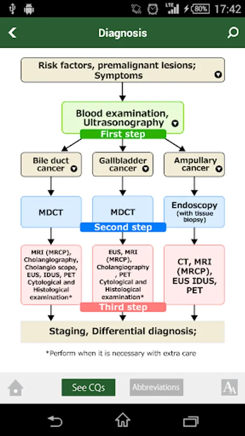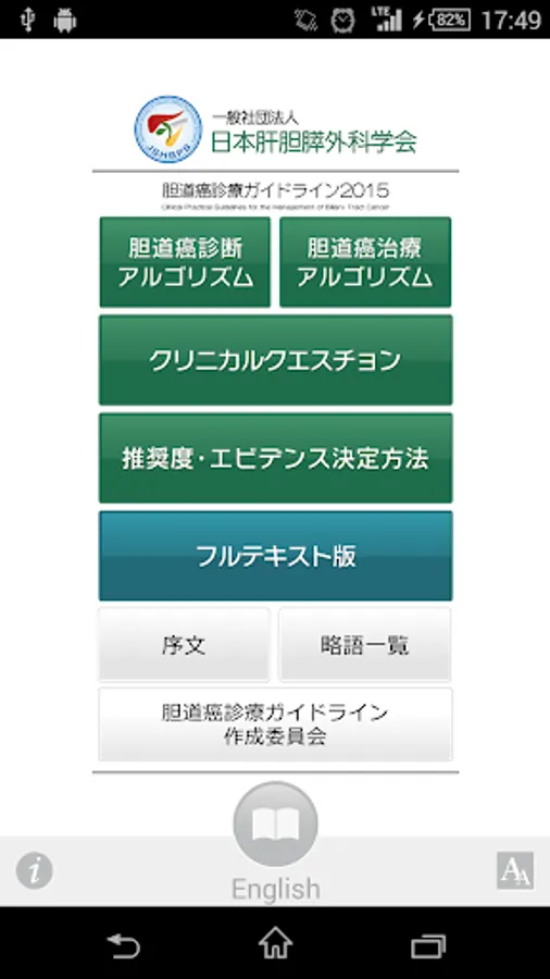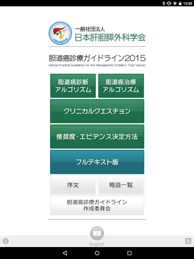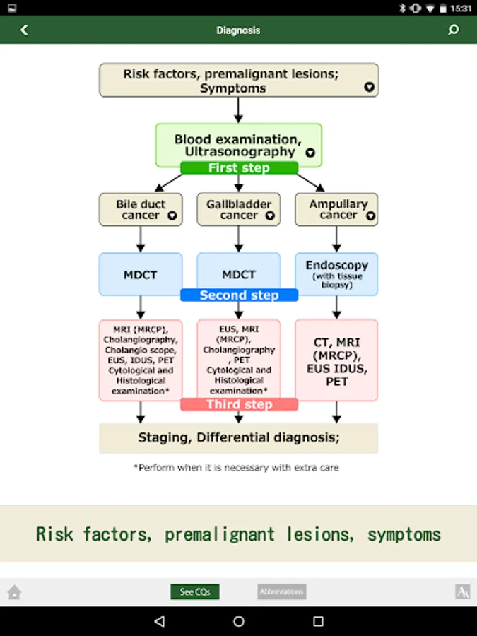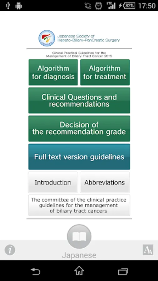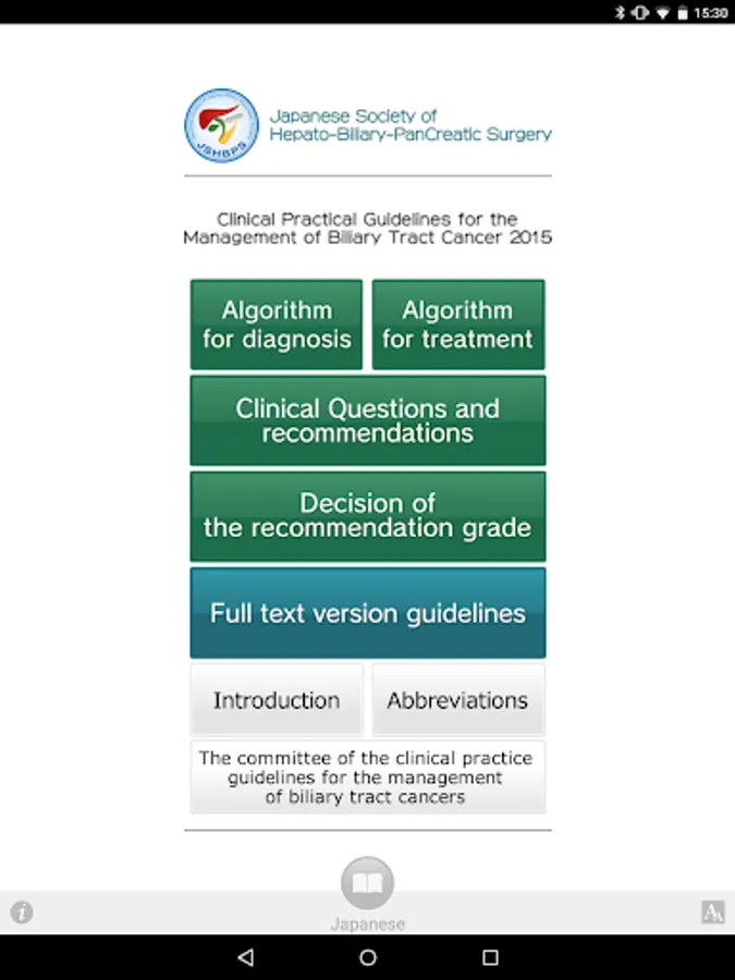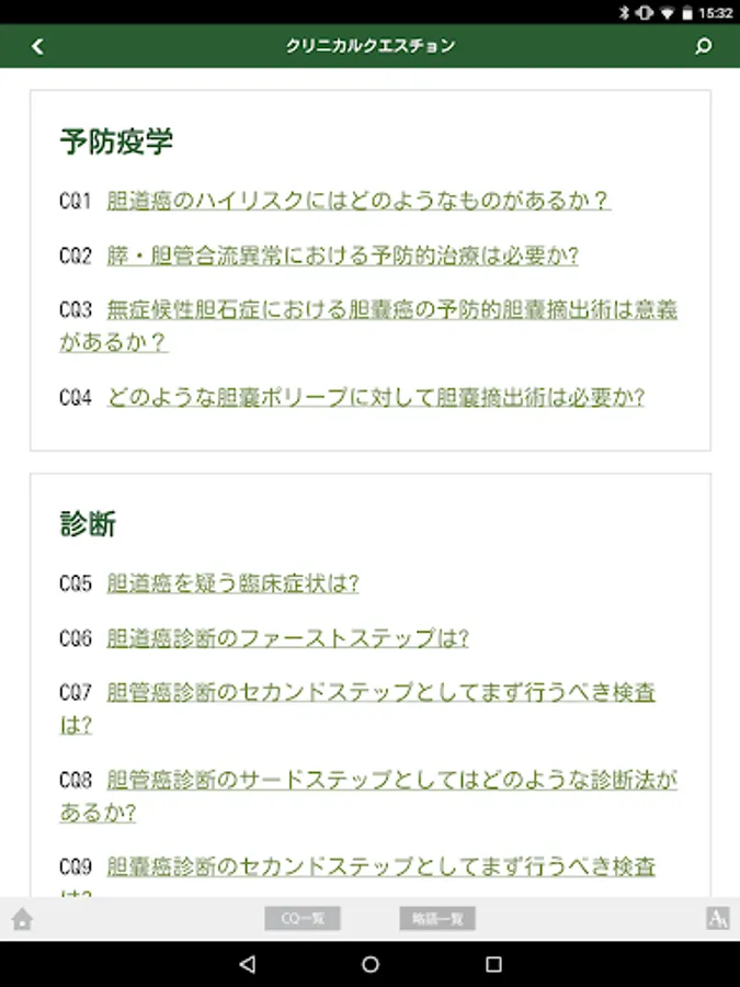 This application is to condense the contents of the "biliary tract cancer clinical practice guidelines based on evidence" that was published in November 2014, has been developed in order to convey the information immediately useful in clinical practice. Major part a is diagnostic and treatment algorithm of guidelines, and we have to digest and its commentary recommended degree of clinical question (CQ). In algorithm screen it is possible to switch the display / non-display of a link to the corresponding clinical question, you can fit the screen display to use.