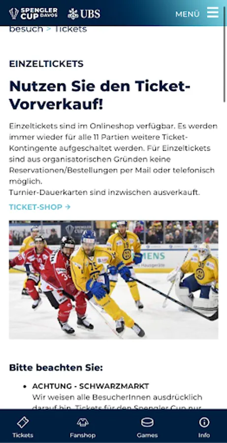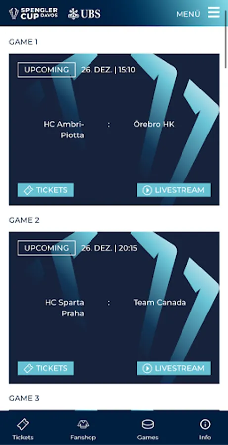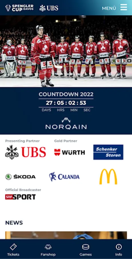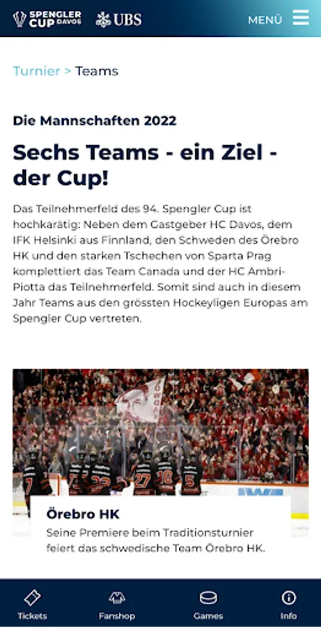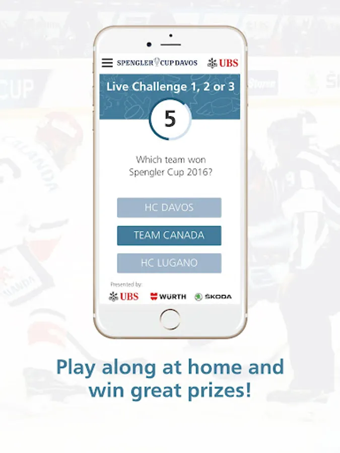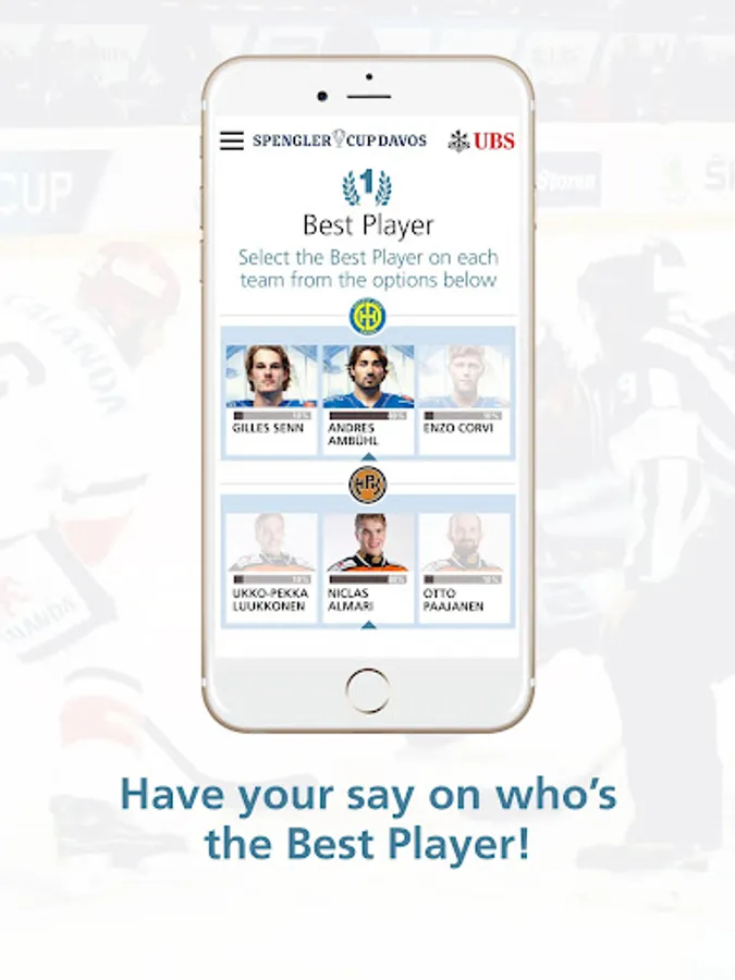 Game-ticker, live stream, line-ups, schedules and rankings. News and background stories about the participating teams and players. Current offers from Ticketing and Fanshop, as well as information about travel, entertainment and catering. And with the Spengler Cup App, you determine the UBS key players for each game. Which player impressed you the most? Choose who should be awarded the most valuable player by our presenting partner UBS at the end of the game!