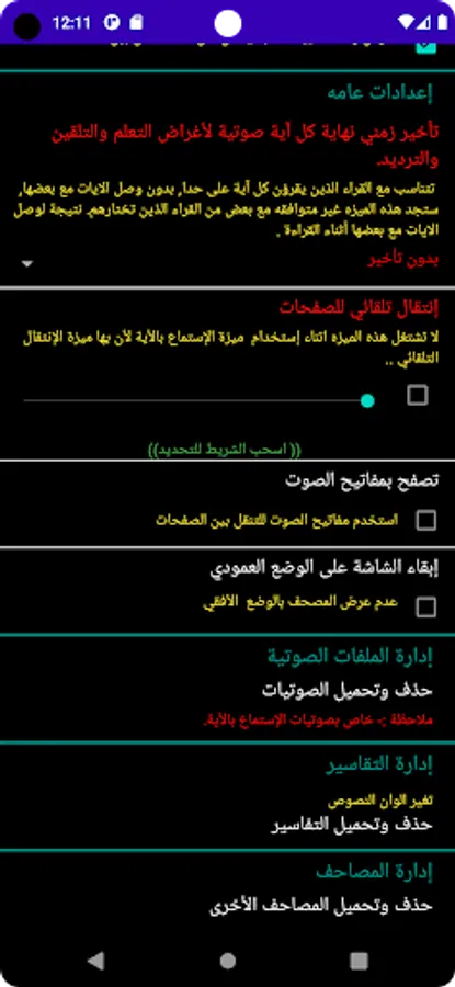 * The possibility of making a time interval (silence) between each verse and verse during the reading of one of the sheikhs to display teaching and repeating.