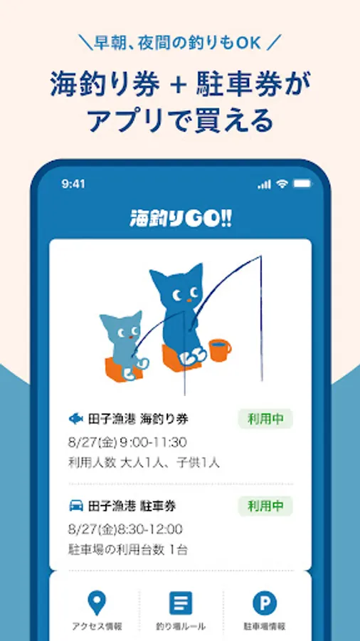 With sea fishing GO, everything from purchasing a sea fishing ticket to reserving a parking lot is completed on your smartphone! You can enjoy sea fishing leisure at fishing ports and harbor facilities.